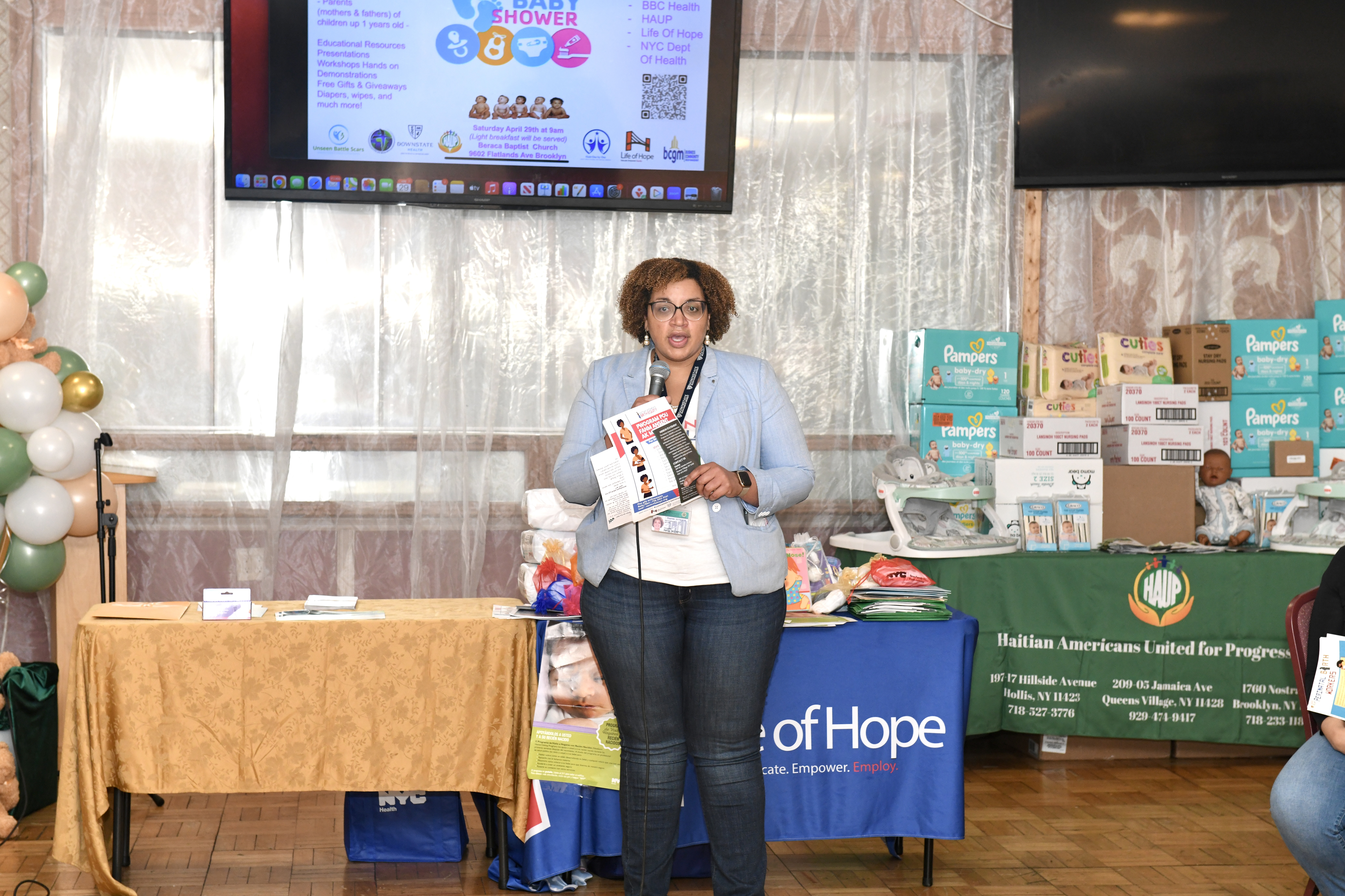 In collaboration with the New York City Department of Health, Haitian Americans United for Progress (HAUP), representatives from SUNY Downstate Hospital, Fidelis Care, the office of State Senator Roxanne Persaud, Fresh as Daisy Kid Spa and the Life of Hope center, families received supplies of diapers, baby wipes, monitors, creams, car sets, strollers, gift certificates, books and other items for newborns and children up to 1 year old.