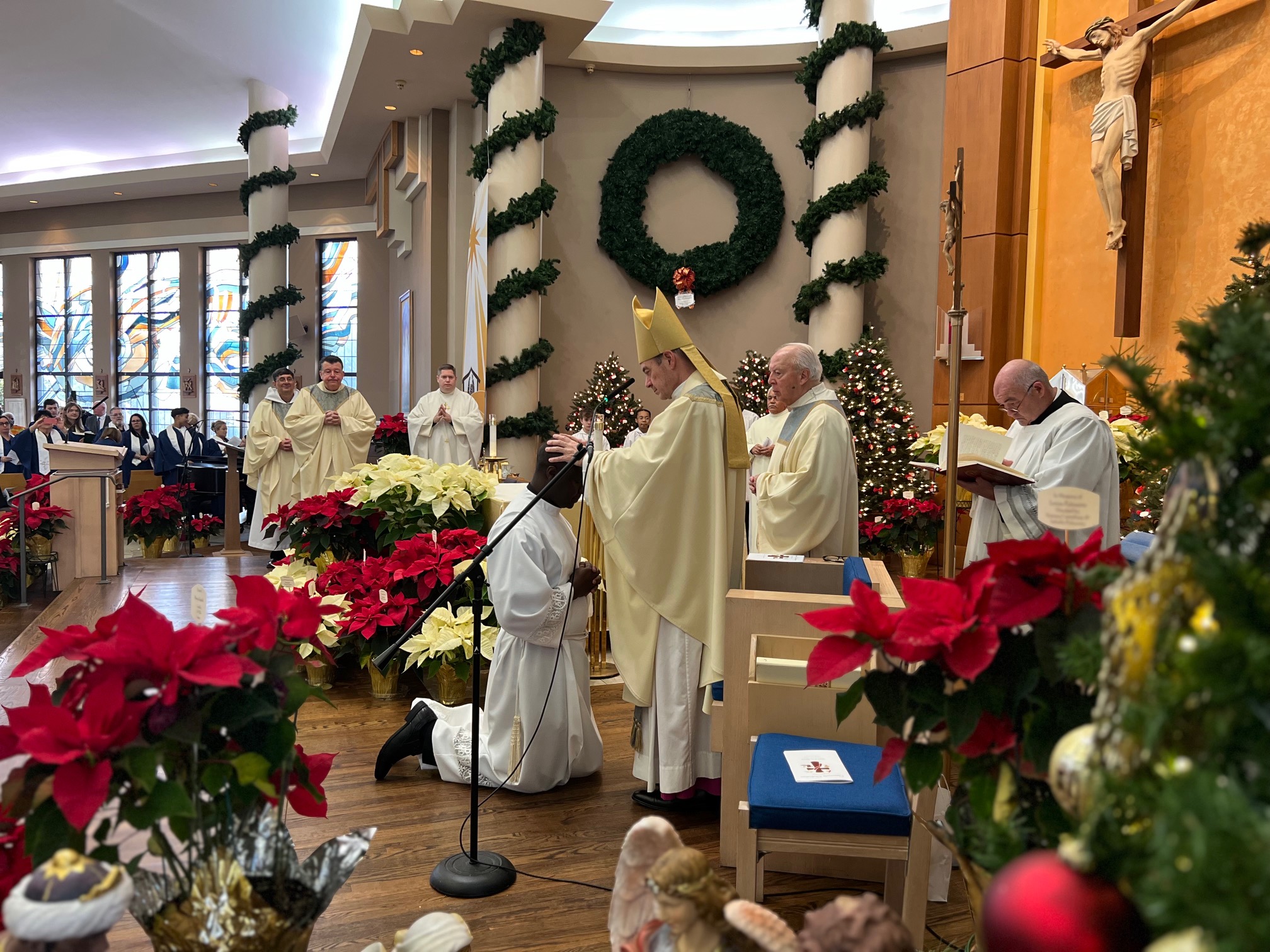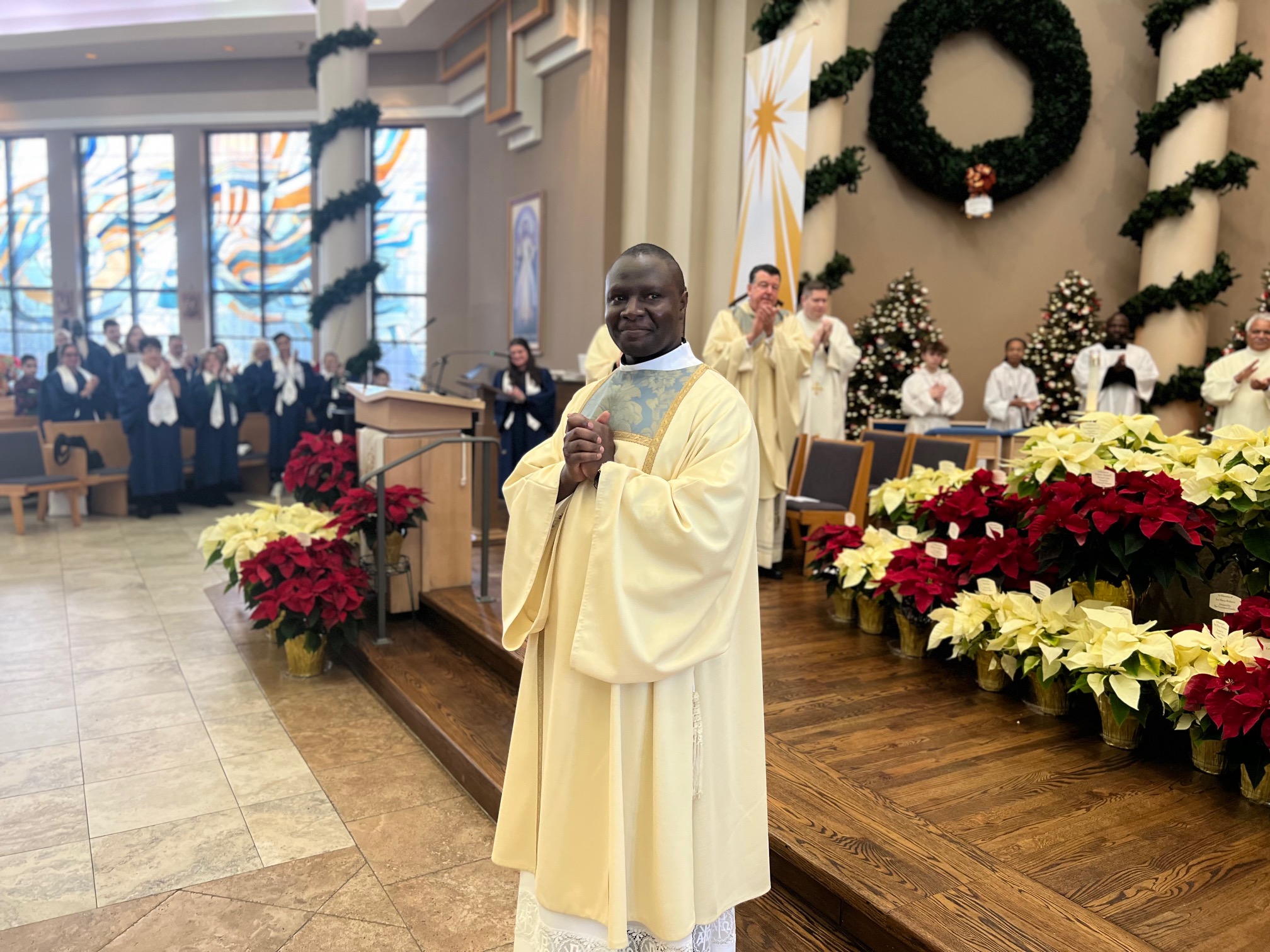 Monsignor Joseph Grimaldi vested Deacon Samuel for the first time during the Mass of Ordination, attended by hundreds of people. A reception followed in the school gym.