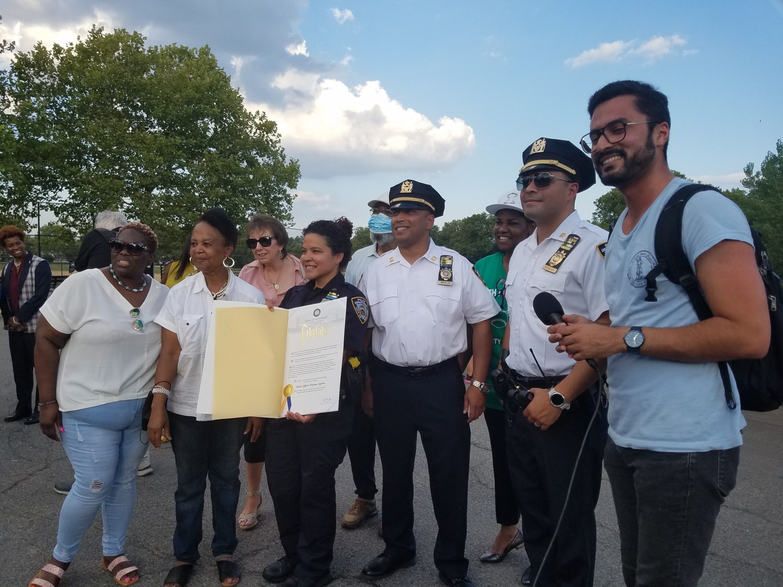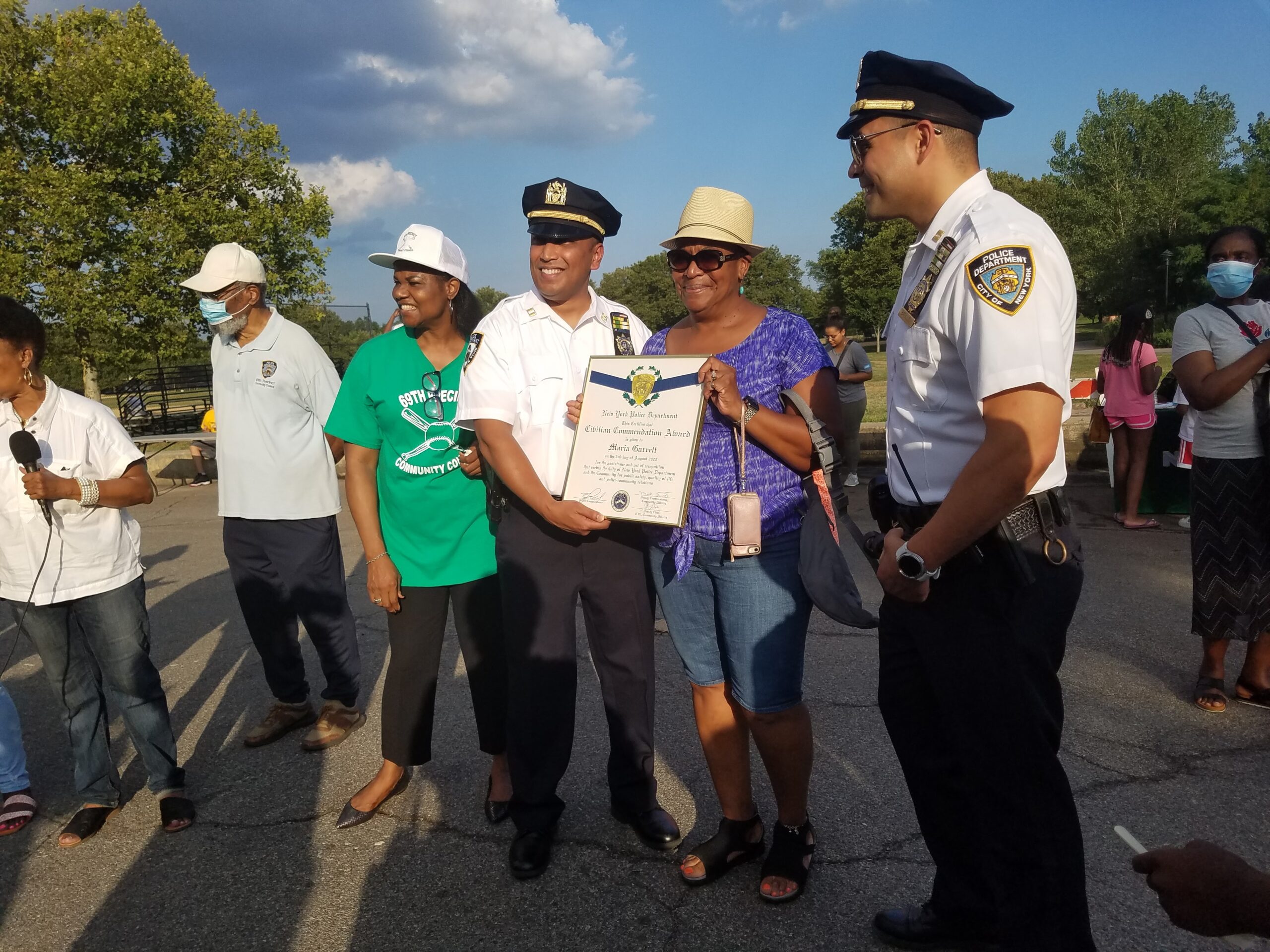 The evening’s festivities also included an Awards Ceremony with the first Citation presented to Captain Abdullah by a representative from the Office of Mayor Eric Adams. NCO Viviana Segovia was presented with two Citations, one from Borough President Antonio Reynoso’s office, the other from her own Commanding Officer, Captain Abdullah, who also conferred the same honor on civilian, Maria Garrett, a community activist and President of the Fresh Creek Civic Association. The 69th Precinct Community Council, which was largely responsible for organizing the Night Out, received a Citation from the office of State Senator Roxanne Persaud.