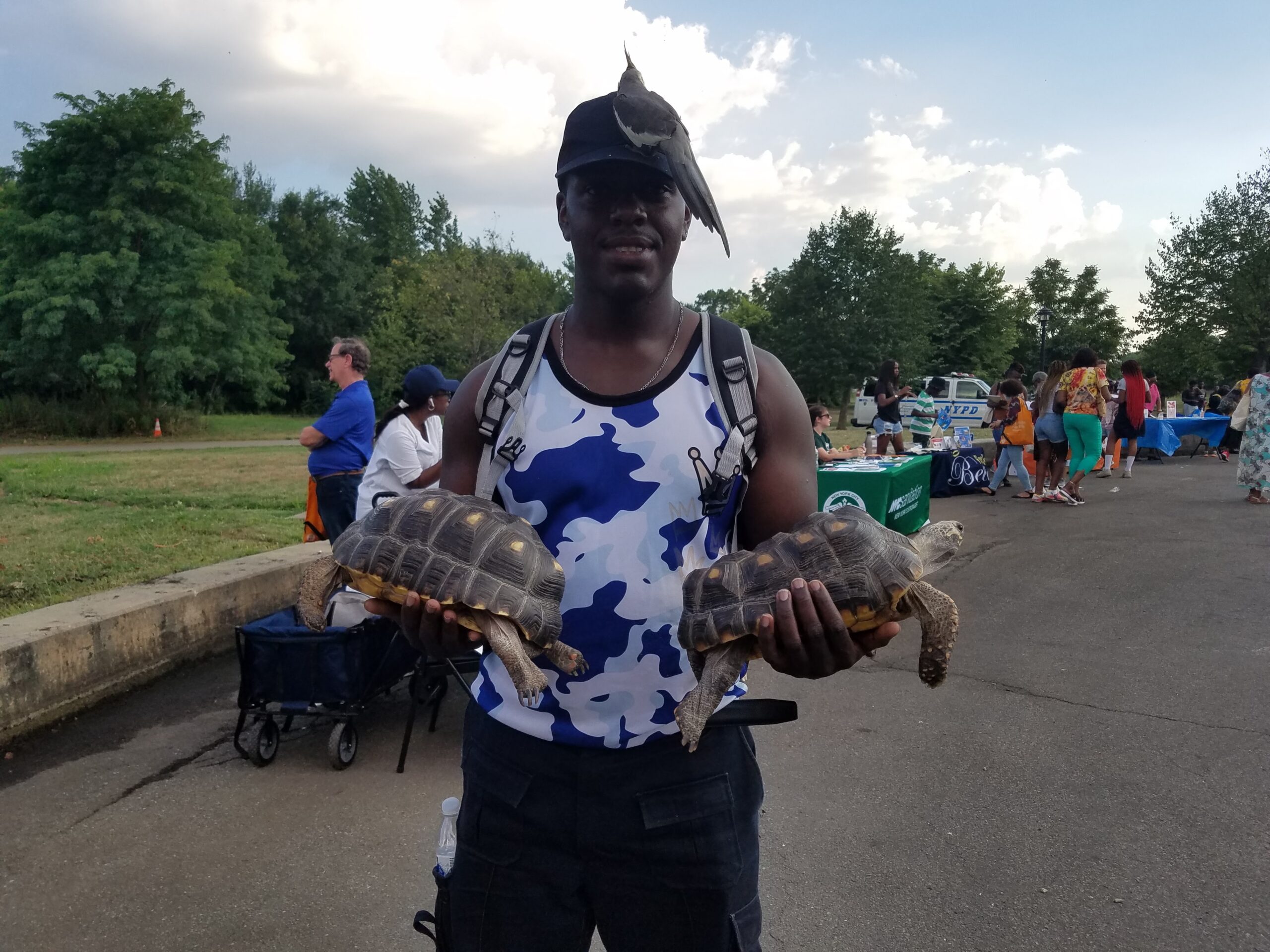 At Canarsie Park, residents from the 69th Precinct turned out in droves to celebrate and enjoy a much-needed respite from the relentless acts of gun violence and other crimes that have plagued many communities. Surrounded by scores of NYPD brass of every rank, children rode their bikes and scooters, swung hula hoops and enjoyed sno-cones and ices. A young man named Boyeston Taylor even brought his pets – Alex, a cockatiel perched quietly on his head, and two baby tortoises, George and Shelly, that he allowed to crawl around, much to the delight of the children.