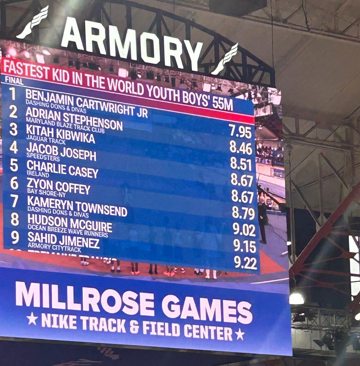 Cartwright participated in the Millrose Games, a large annual indoor track and field competition held at The Armory in Manhattan, on Saturday, February 8th. He ran the youth boy’s 55-meter race and came in first place, winning gold and earning him the title of the fastest kid in the world.