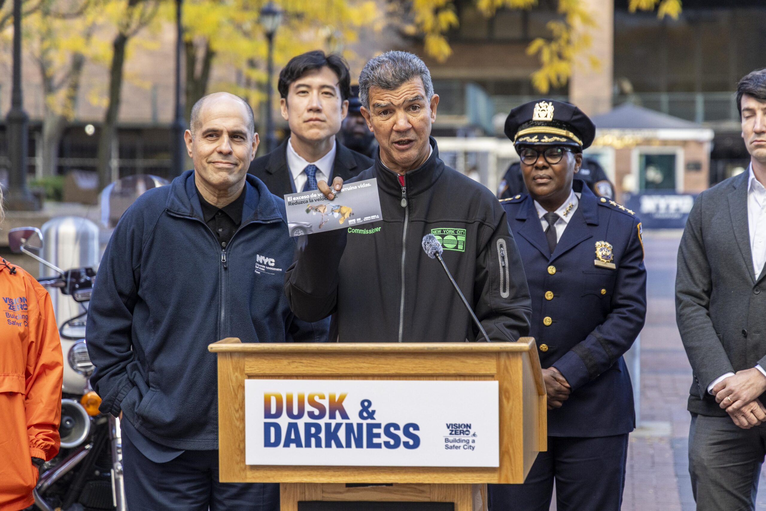 NEW YORK – New York City Department of Transportation (NYC DOT) Commissioner Ydanis Rodriguez and New York City Police Department (NYPD) Chief of Transportation Olufunmilola Obe were today joined by partners in the city’s Vision Zero initiative to kick off the annual ‘Dusk and Darkness’ public safety campaign to keep New Yorkers safe on city streets, ahead of the end of daylight-saving time this Sunday, November 2.