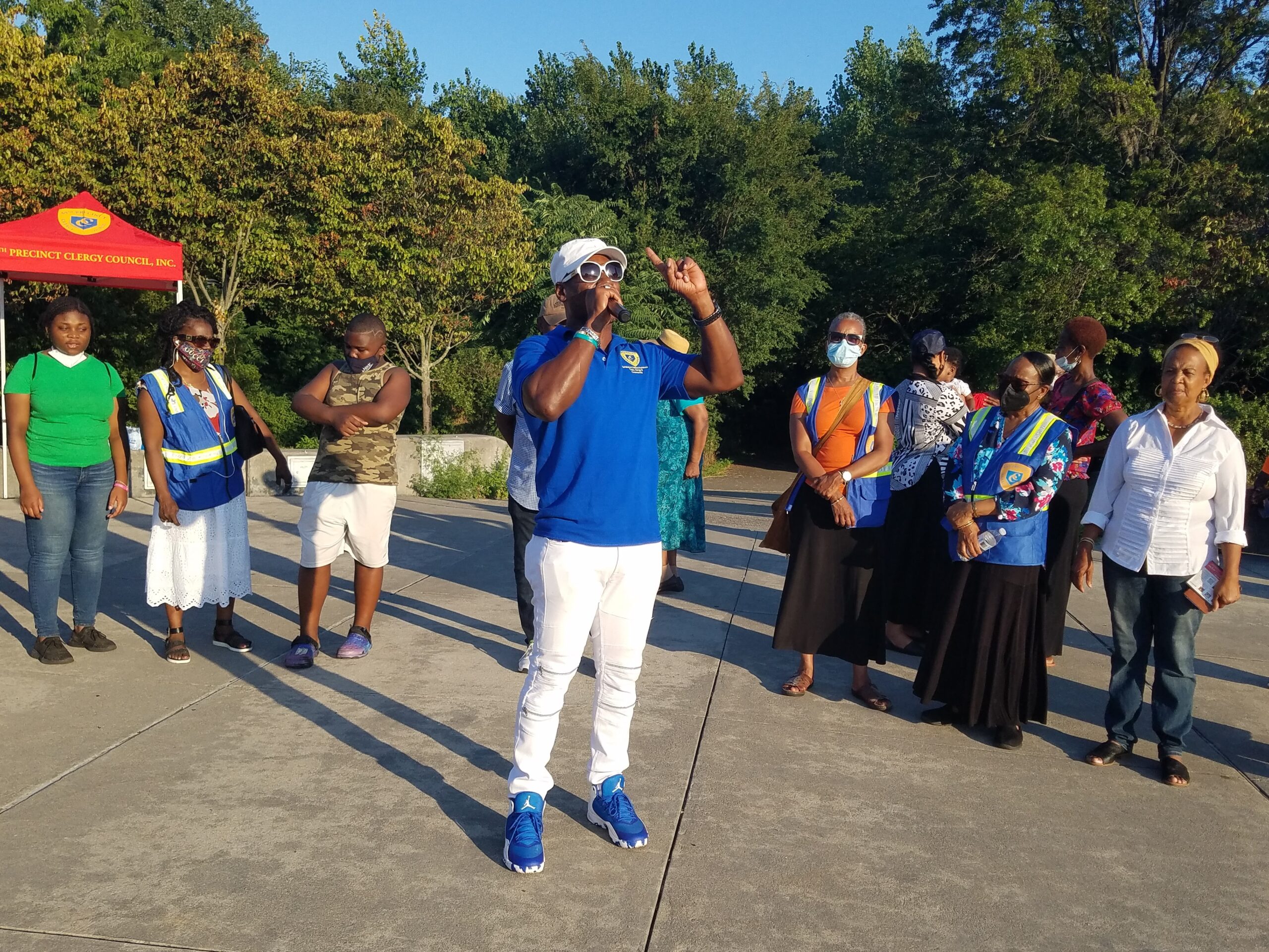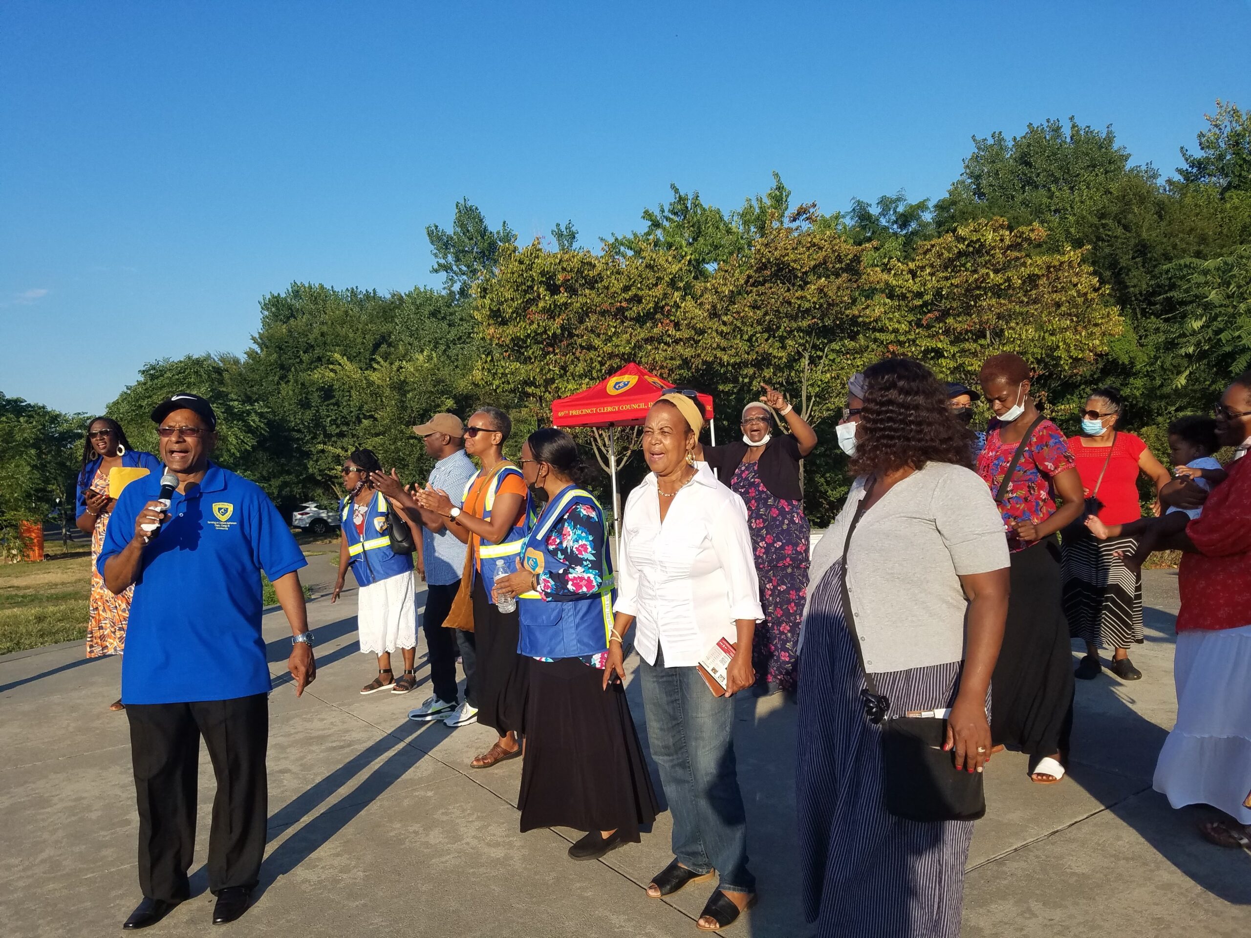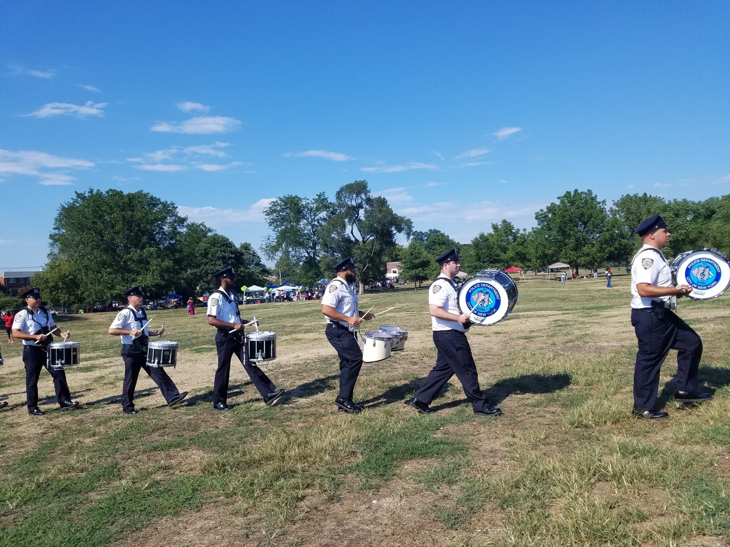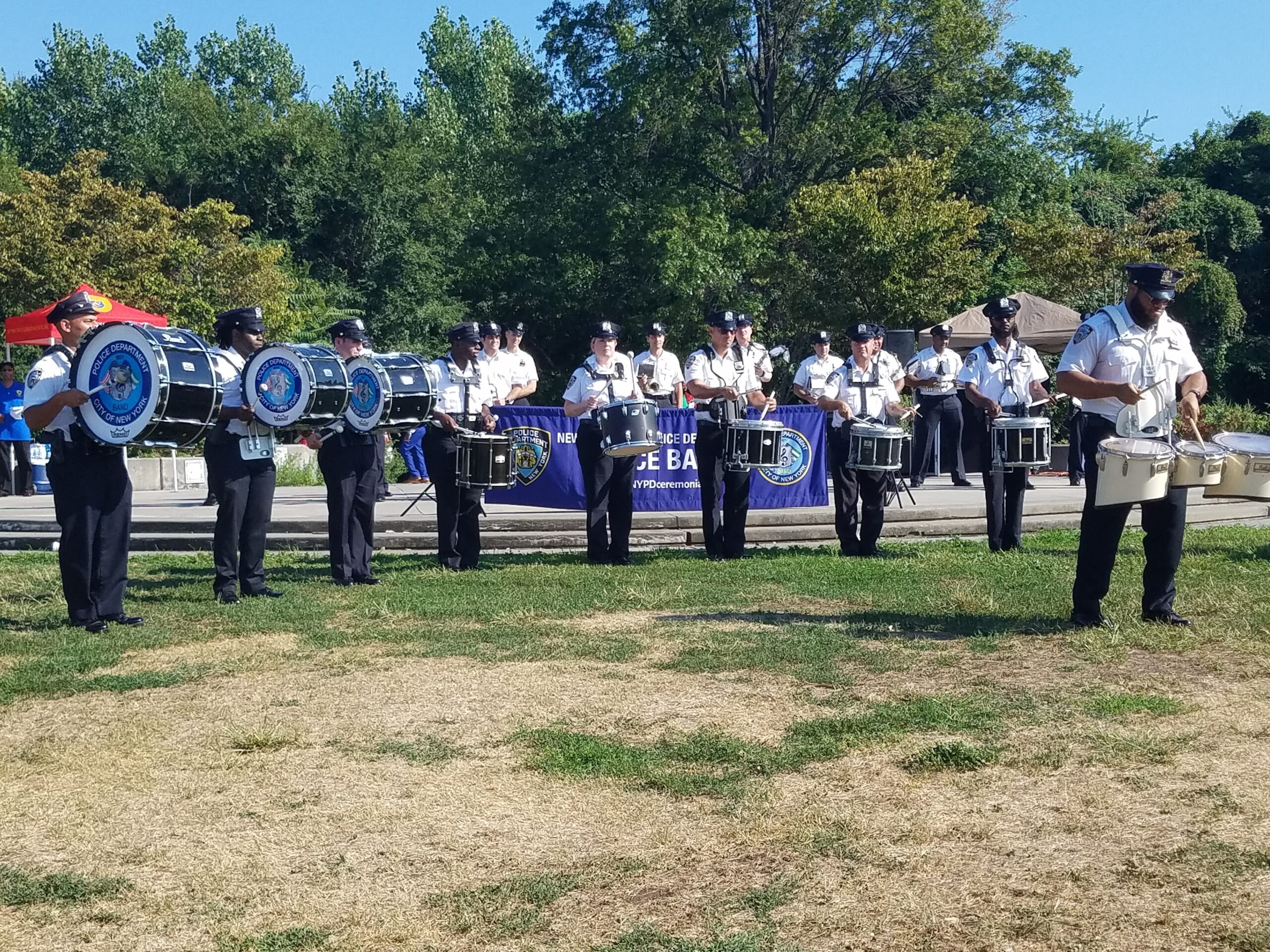 After welcoming everyone, including parkgoers enjoying their private picnics and other celebrations, Rev. Moonsam said an opening prayer. “God, we thank You for Your many Blessings on the community and especially for protecting the NYPD as they protect us. We know You have a plan and a purpose for what we are doing in this community.” He then introduced the 69th Precinct Marching Band, which made quite a splash, as they paraded into the park from Seaview Avenue and East 87th Street. The band delighted parkgoers with renditions of “When The Saints Go Marching In,” “How Great Thou Art” and “Stand By Me.”