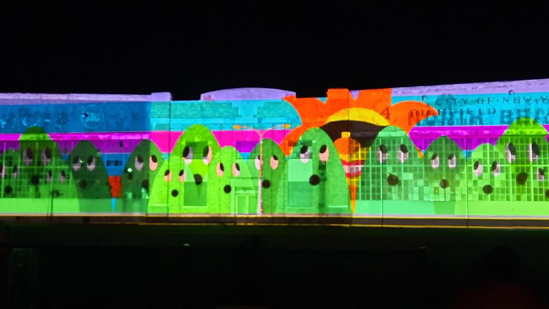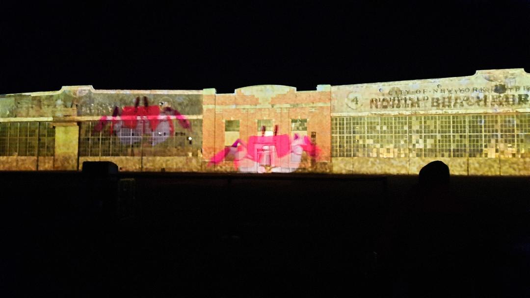 After sunset, guests sat on lawn chairs, some wrapped in blankets, to view the almost hour-long digital artwork display created by local artists, including students from Brooklyn College and the Fashion Institute of Technology. For those not familiar with projection mapping, it’s a technique used to turn objects, often irregularly shaped, into display surfaces for video projection. Each original artwork, some focusing on the magic of summer in the Rockaways, highlighted the architectural features on the historic hangars, while the entire program was set to music.