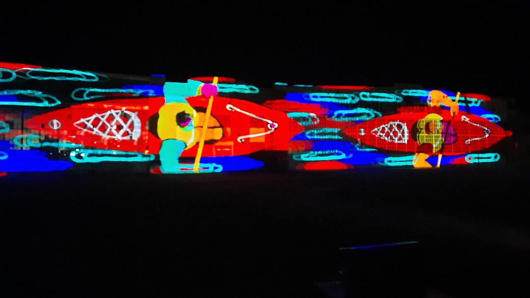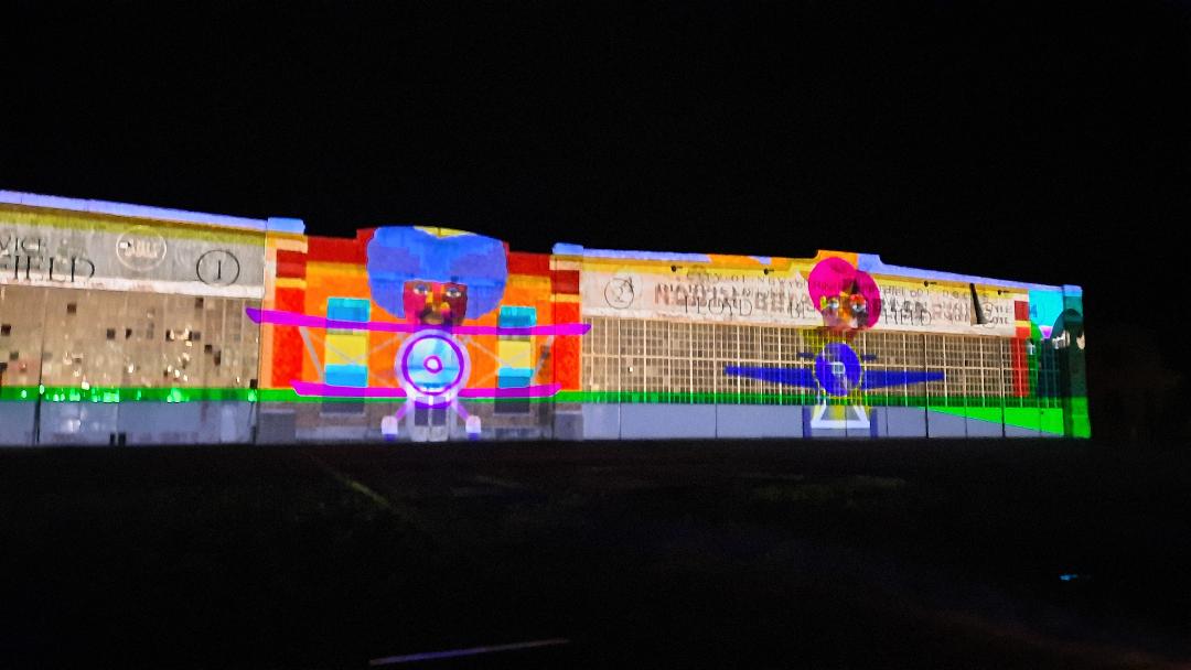View some of the beautiful digital artwork, projection mapped onto historic hangars 3 and 4, below.