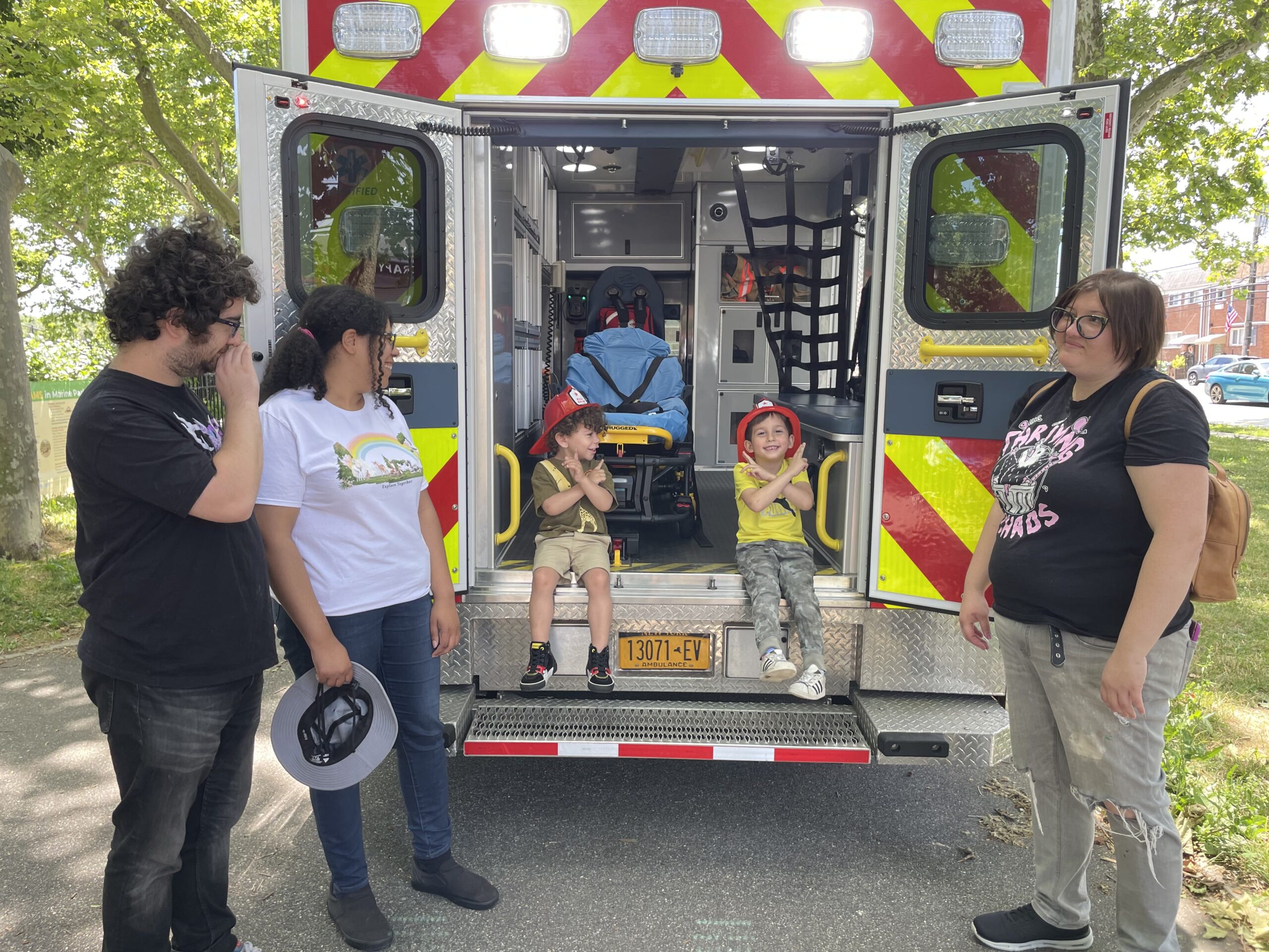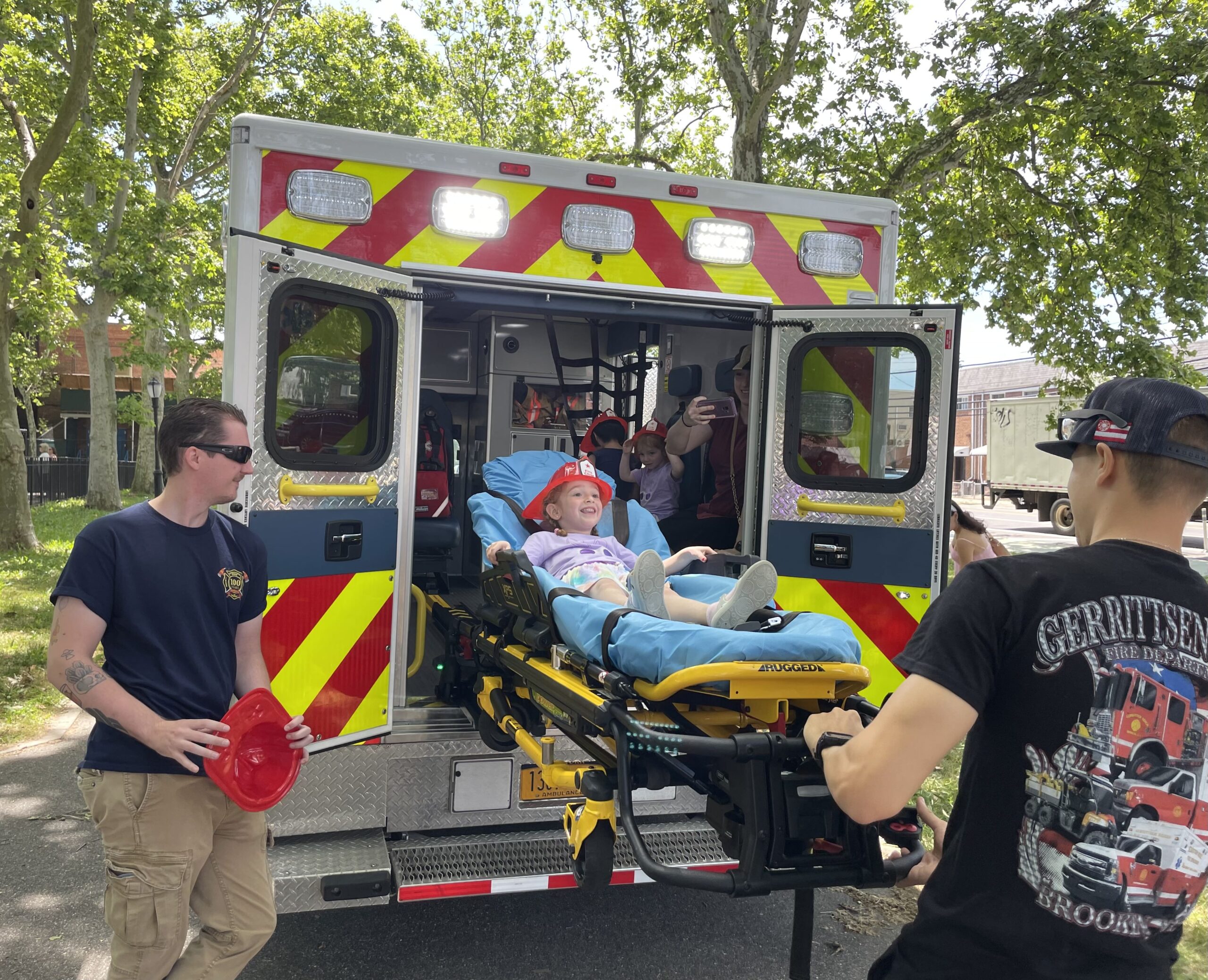 The Gerritsen Beach Volunteer Fire Department (GBFD), also known as the Vollies, provided an inside tour of an ambulance in a safe, calm setting for kids to participate. Children were also provided plastic firefighter chief hats and coloring books. They even had a chance to sit on a stretcher.