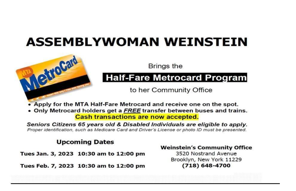 The bus is available every first Tuesday of the month outside Weinstein’s office, at 3520 Nostrand Avenue. The next bus will be at her office on Tuesday, February 7th, from 10:30 a.m. to 12 p.m.
