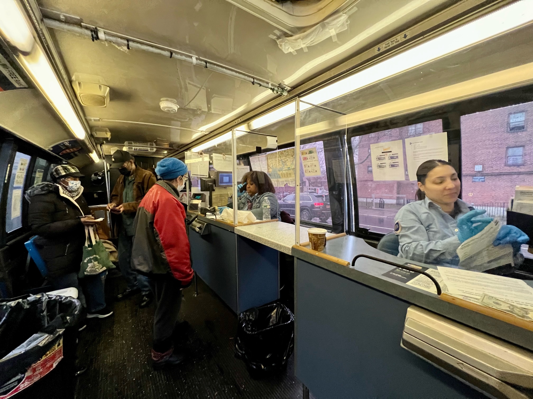 The bus itself, which looks like an official MTA bus on the outside, is surprisingly similar to a mobile office on the inside with windowed stations to take care of customers seeking a new card or looking to add money to their existing card. A photo is taken and cash payment is accepted.