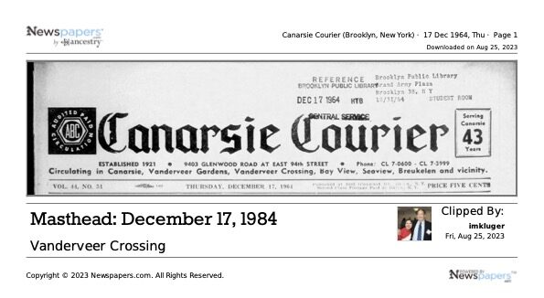 A map, prepared by Surveyor R. L. Williams in 1906, which is in the possession of the Library of Congress, and can be accessed via https://www.loc.gov/item/2005626329/, documents that the area surrounding the East 105th Street subway station was at that time referred to as Vanderveer Crossings. In addition, attached is a masthead of a Canarsie Courier published in December 1964, documenting that the name Vanderveer Crossing remained in use as late as that time.