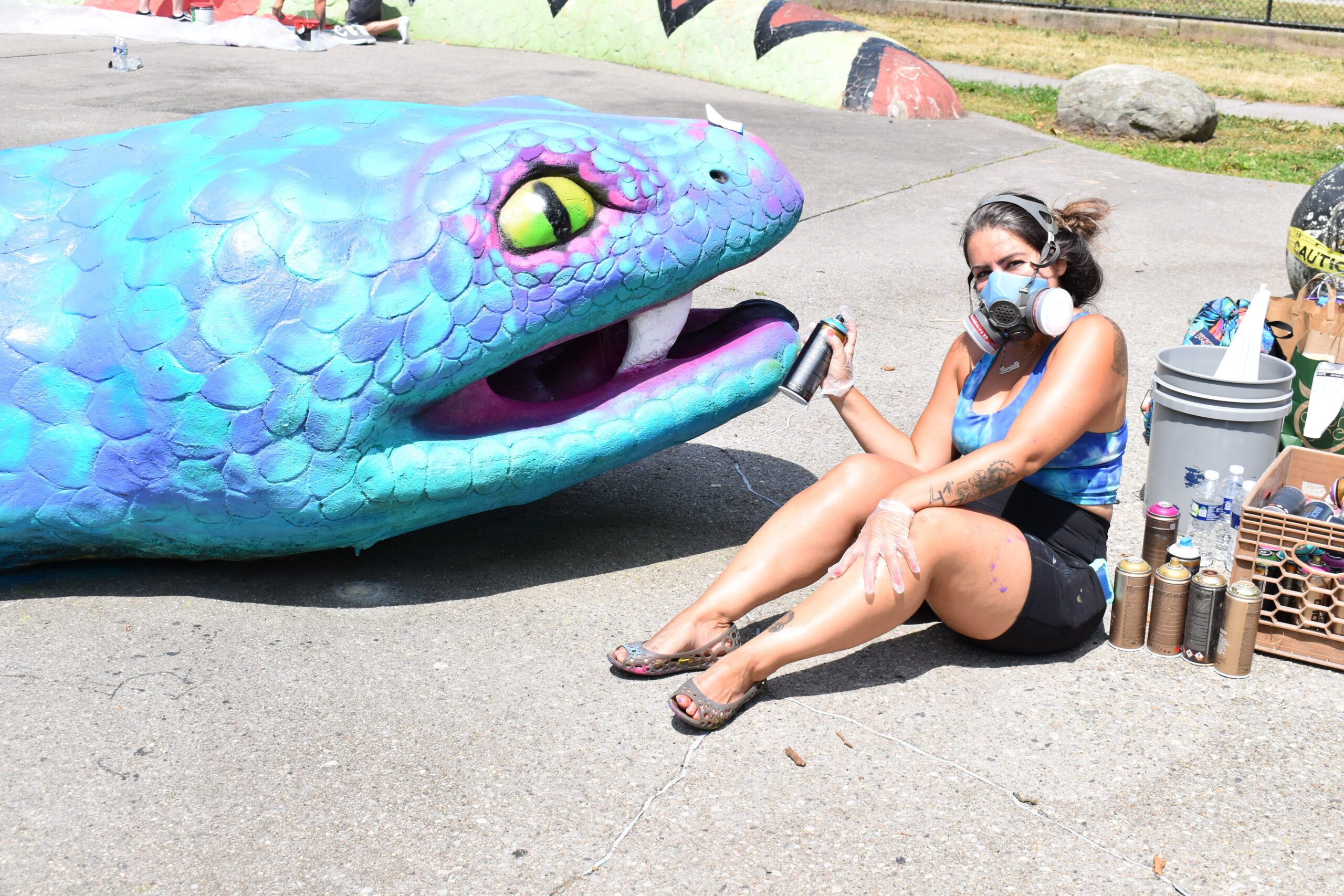 Throughout the morning, volunteers swept up leaves, added a fresh coat of paint on benches and fences, and a muralist added a new layer of “skin” to the park’s iconic snake sculpture.
