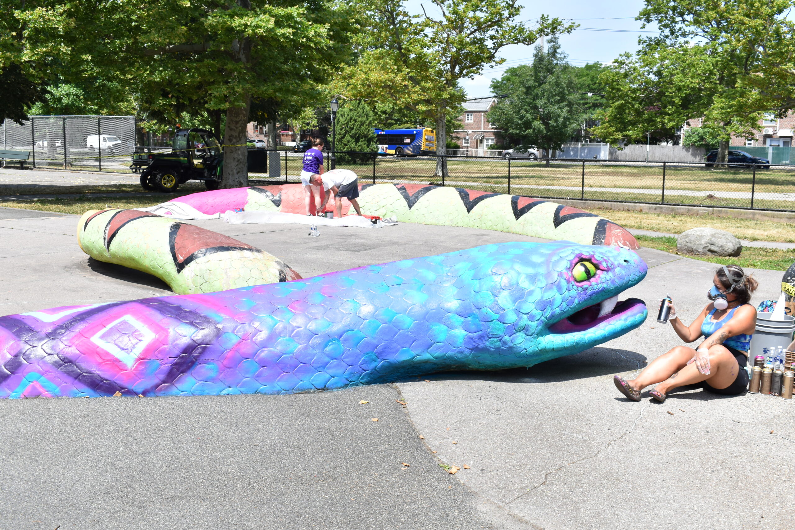 Danielle Mastrion, a muralist, was asked to repaint the snake sculpture with more vivid colors to help revitalize the playground. Mastrion previously painted a mural at the entrance of Shirley Chisholm State Park, the rear wall of Gargiulo’s restaurant on Stillwell Avenue and the New York Aquarium, among other locations.