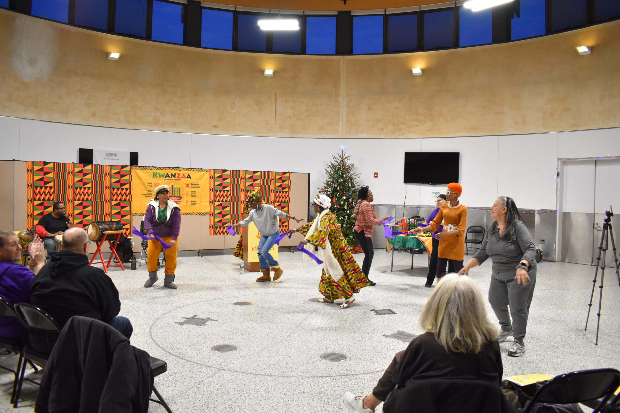 “I was thrilled by the outpouring of community support, particularly seeing people of all ages and cultural backgrounds come together to learn about the history of Kwanzaa,” said Moody. “The drumming provided by the Healing Drums Community ensemble truly created an atmosphere of Umoja, which is the first of the Nguzo Saba of Kwanzaa. I felt great pride and joy at seeing how enthusiastically the audience members participated in tonight’s pre-Kwanzaa celebration, from dancing and singing to reciting the Nguzo Saba during the candlelighting ceremony.”
