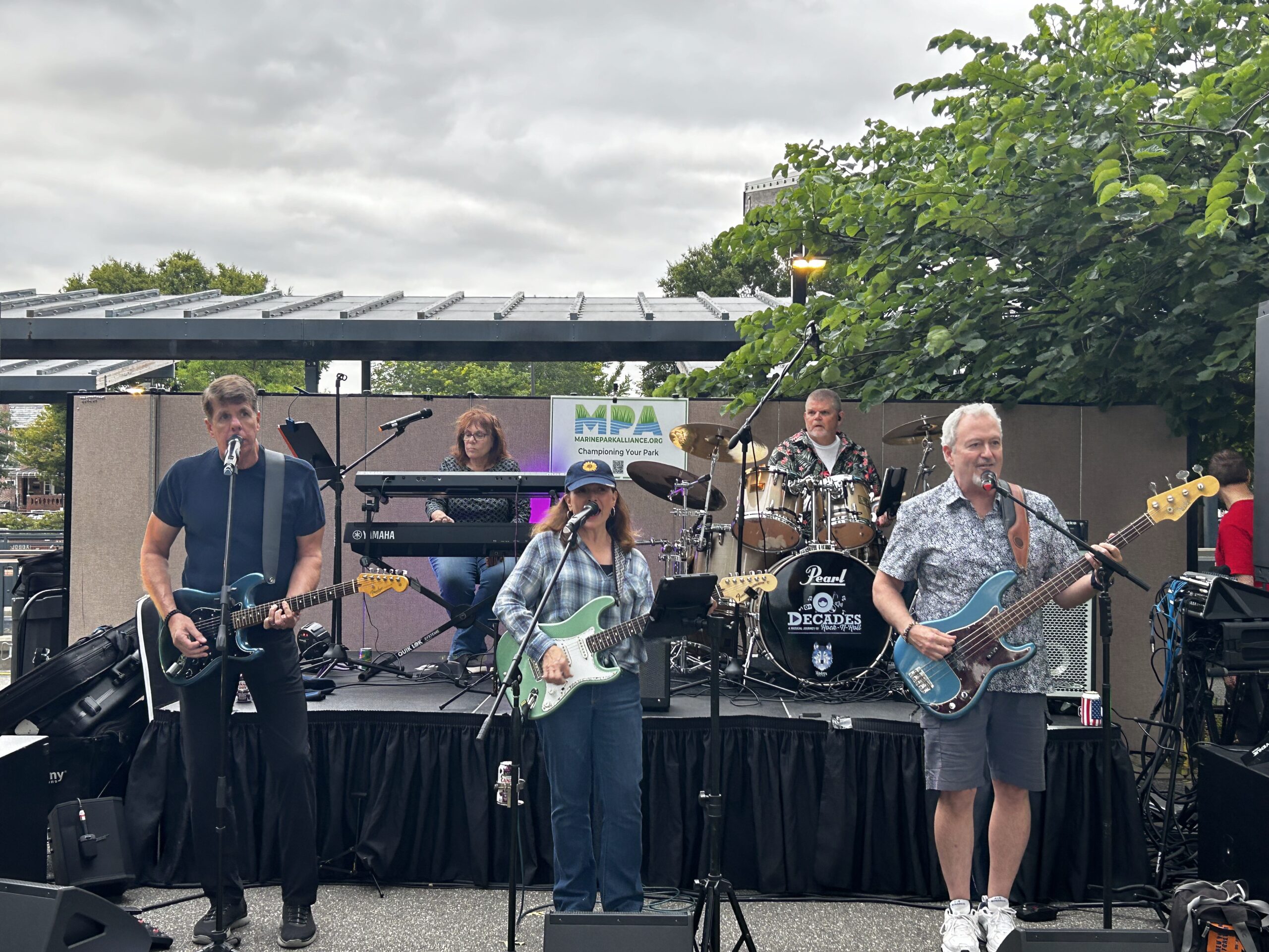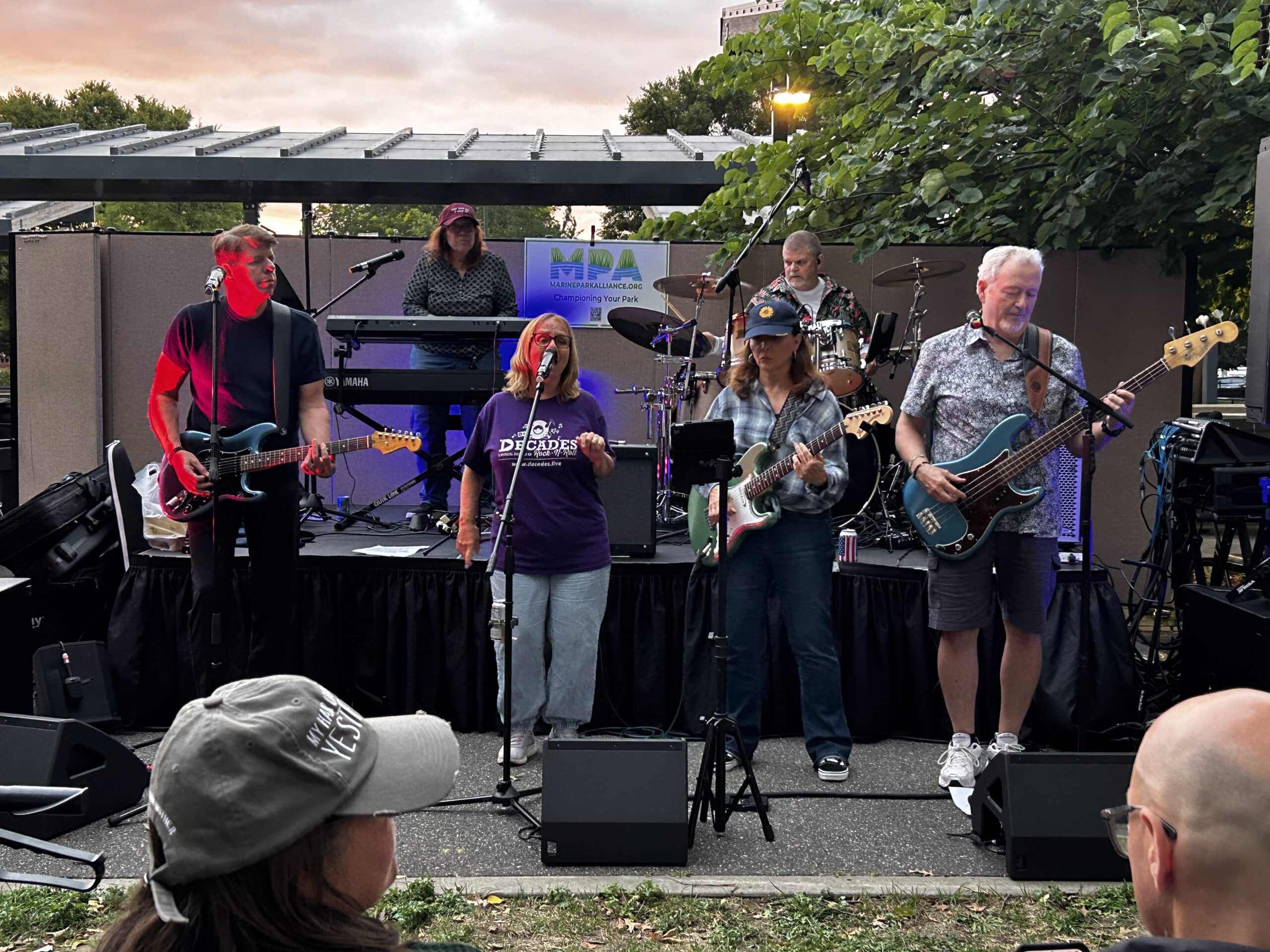 Crowds gathered on Thursday, August 21st (Wednesday night’s concert was rained out), despite the dreary, fall-like conditions, with hoodies, hats and blankets to see Decades play in Marine Park. This was the seventh concert in a series of Marine Park summer concerts sponsored by Assemblywoman Jaime Williams.