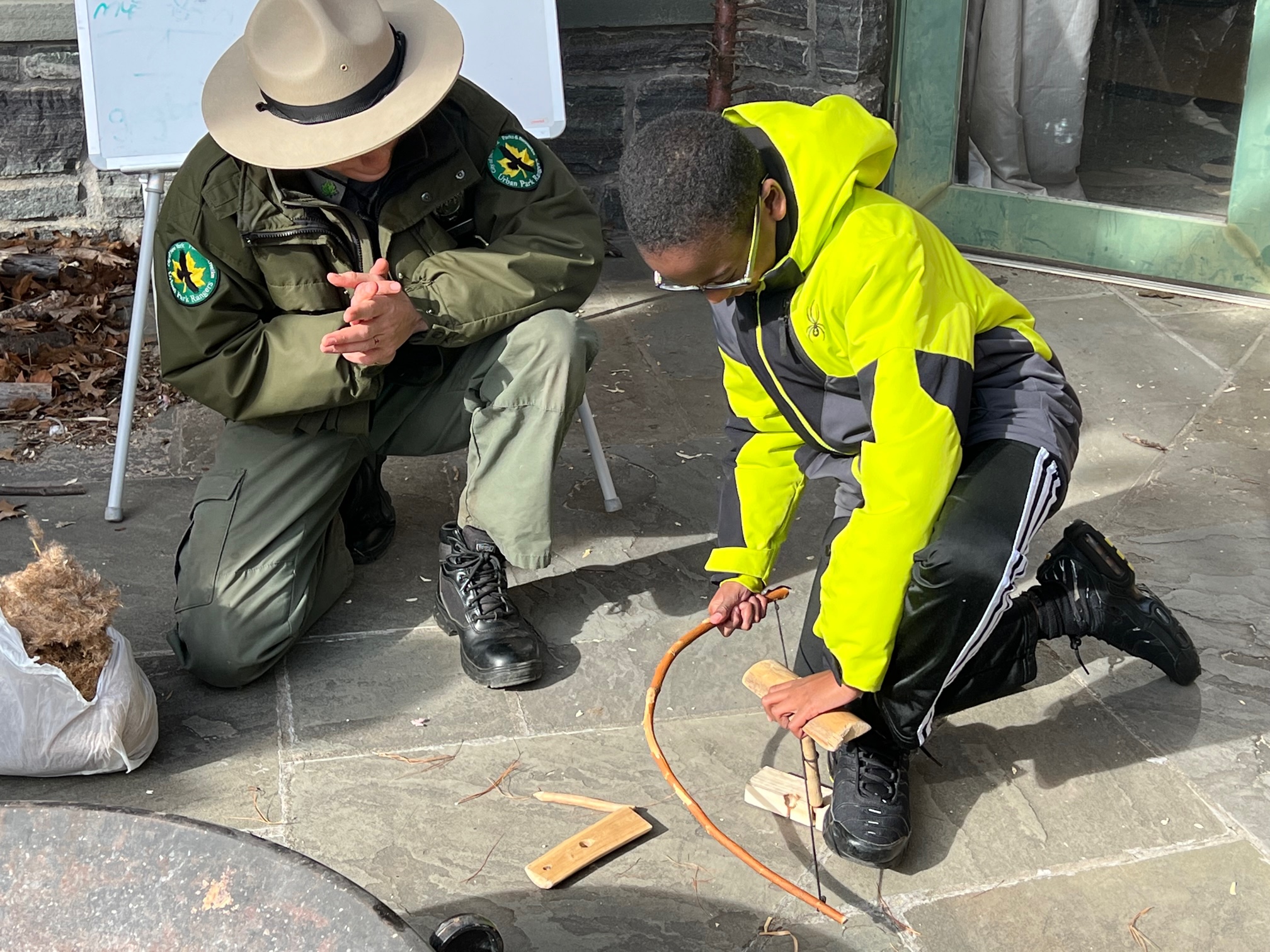 Urban Park Rangers Ian Evans and Gabby Miranda-Diaz had everything prepared in the courtyard, where excited parents and their children gathered around a fire pit with anticipation of building their first fire. There was a pile of wood and other fire-starting materials nearby, along with metal structures and trays for individual practice.