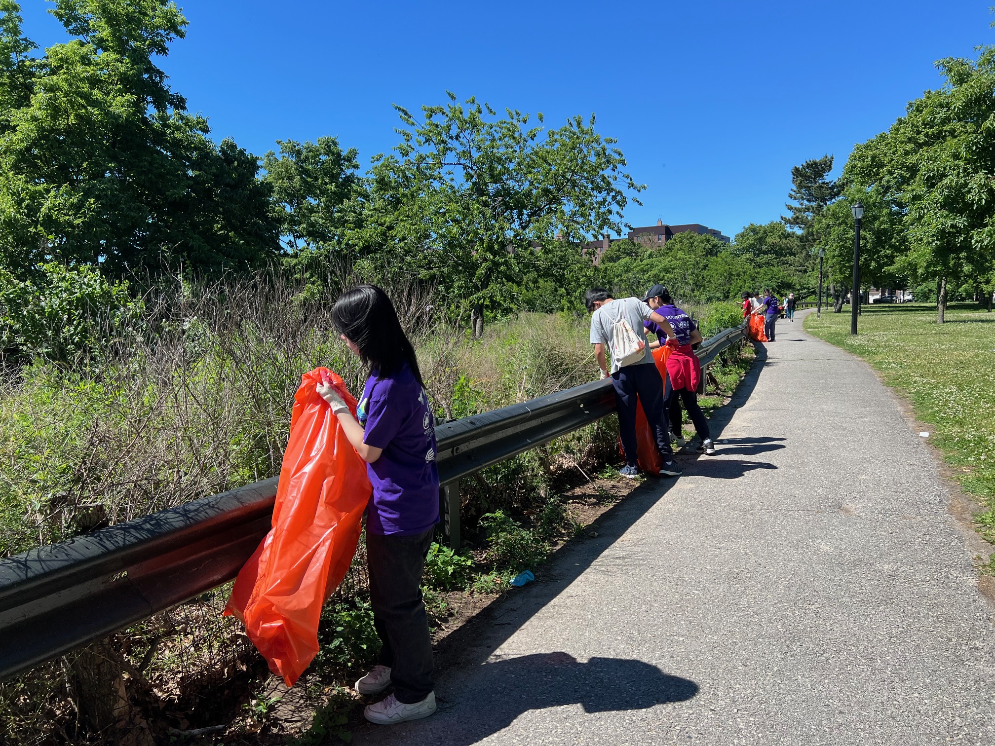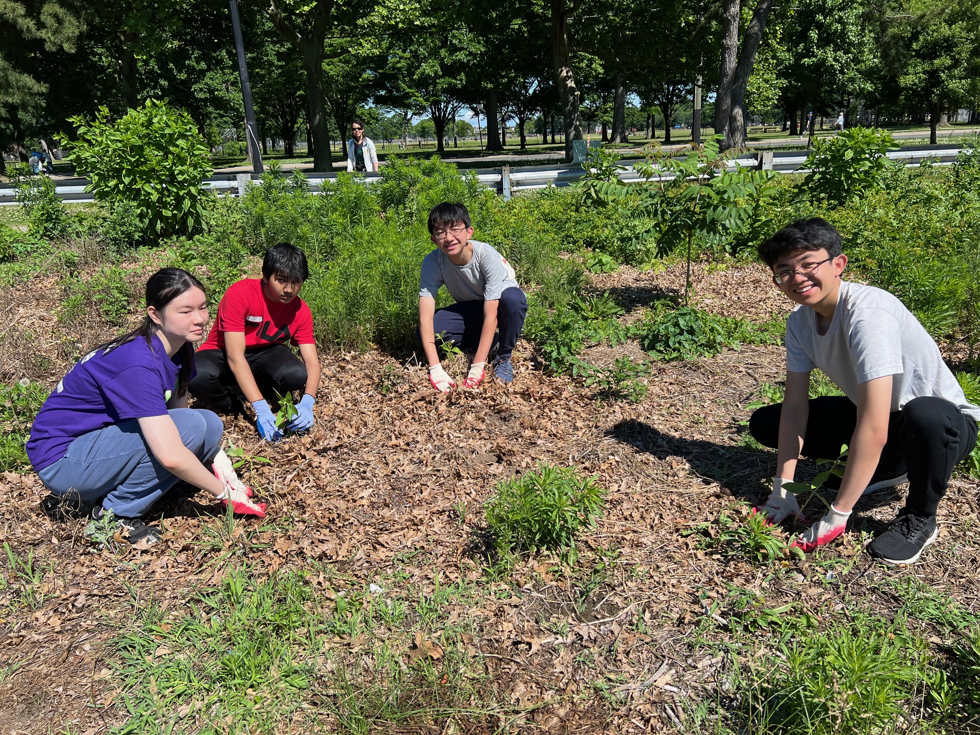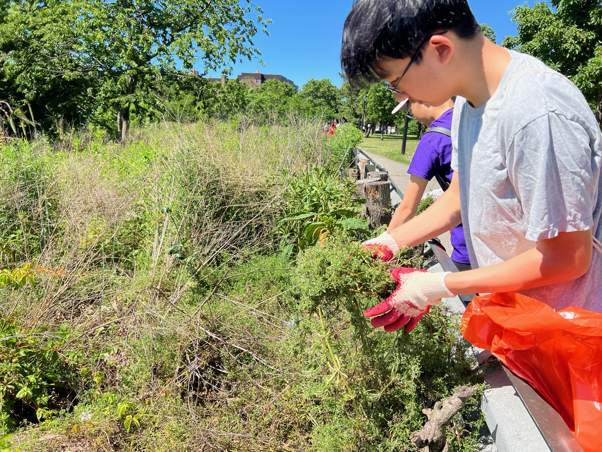 Most of the volunteers were students from Midwood, Brooklyn Tech, Bay Academy and a few other schools. After planting, they pulled out weeds, with special attention to bedstraw, an invasive plant that forms a mat that blocks sunlight from other plants. There were enough weeds and garbage to fill five large trash bags when they were finished. Other volunteers were performing similar tasks all around the park.