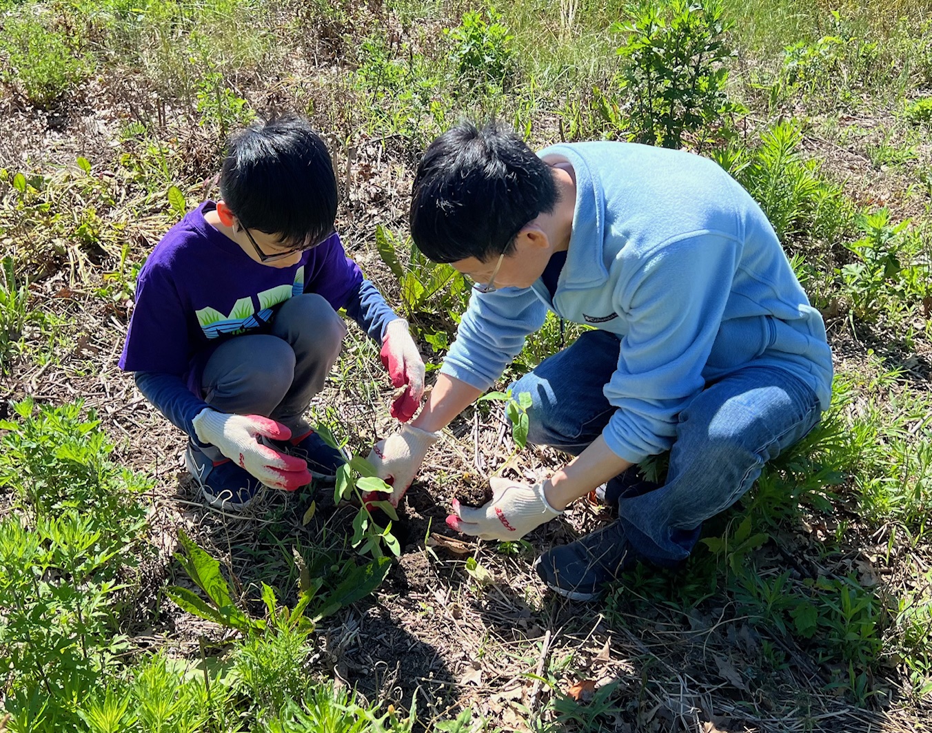They were joined by Retired Chief Naturalist of the Parks Department Mike Feller who gave instructions and helped prepare the area by pre-drilling holes for the careful placement of the milkweed plants by volunteers.