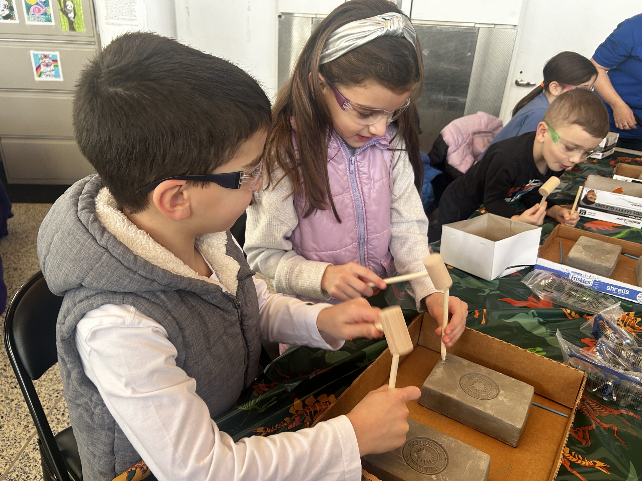 Clips of Wuffy and the Dinosaur Dig played while Rogosin used her teacher-like questioning to engage young minds and enlist discussion among the group. She explained the details of the exciting endeavors that the little archaeologists would get to explore at the different stations, including a prehistoric dig where children got to use a mallet and chisel to uncover fossils, a station where they could make crayon rubbings of ancient shells, leaves and footprints, and one where creative minds could make fossil replicas with Play-Doh.