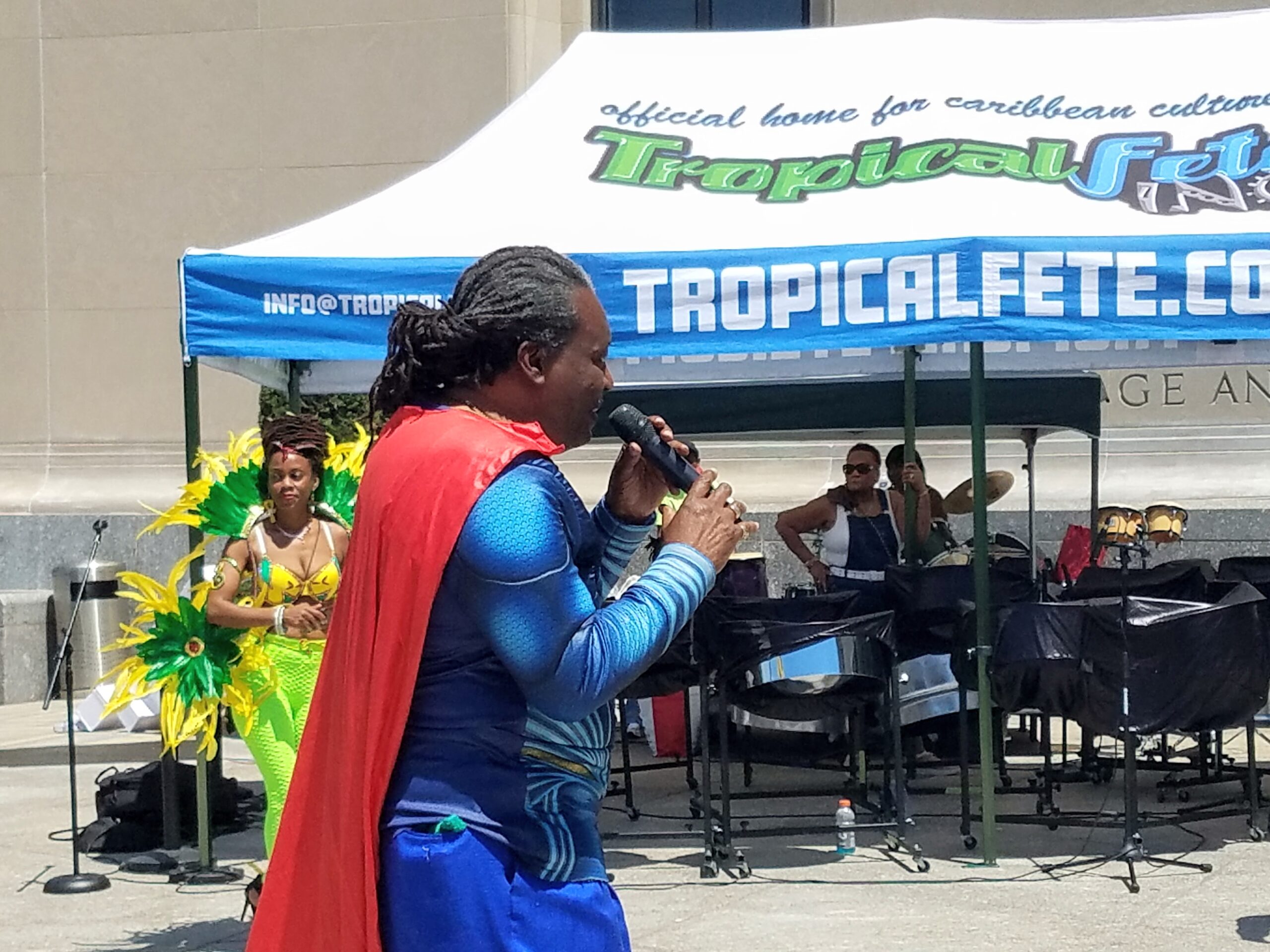 On June 26th, TropicalFete celebrated the occasion with a mini carnival at 10 Grand Army Plaza. The audience witnessed a display of spectacular costumes, one of which was “A Tribute To St. Vincent and The Grenadines.” Calypsonian “Dr. Witty” wowed the crowd in his royal blue outfit, complete with a crimson cape, as he sang “I am a Superman!”