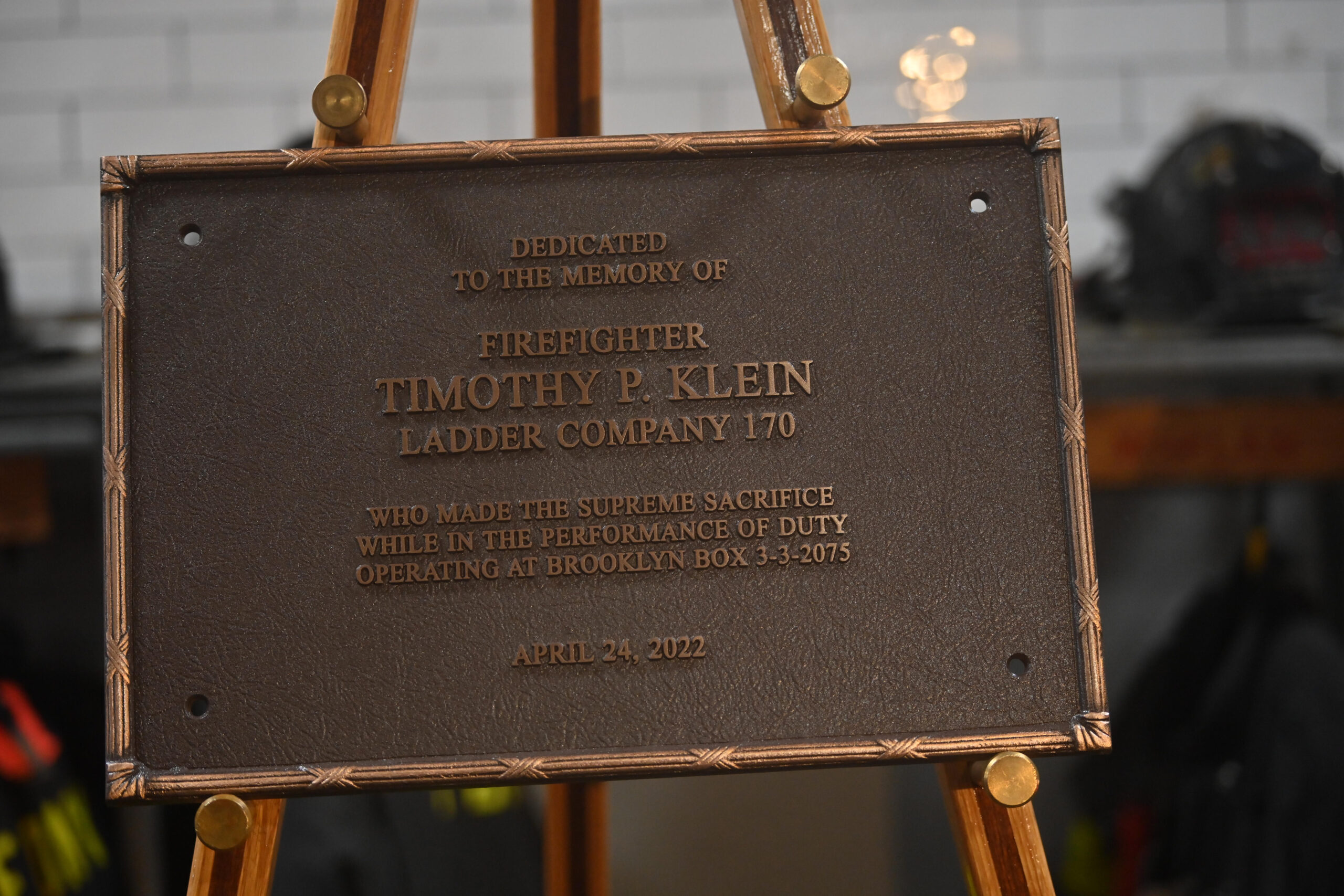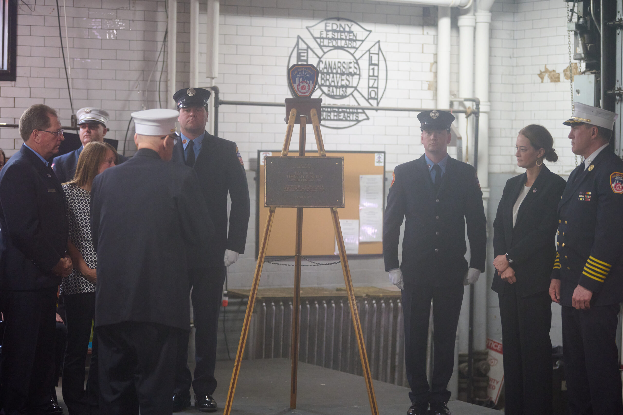 Family, friends and firefighters gathered to remember Firefighter Klein at a plaque dedication ceremony held on Monday, April 24th at Engine Company 257, Ladder 170, Battalion 58, at 1361 Rockaway Parkway. Fire Commissioner Laura Kavanagh presided over the ceremony, and FDNY Chaplain Msgr. John Delendick, retired pastor of St. Jude Church, offered words of solace.