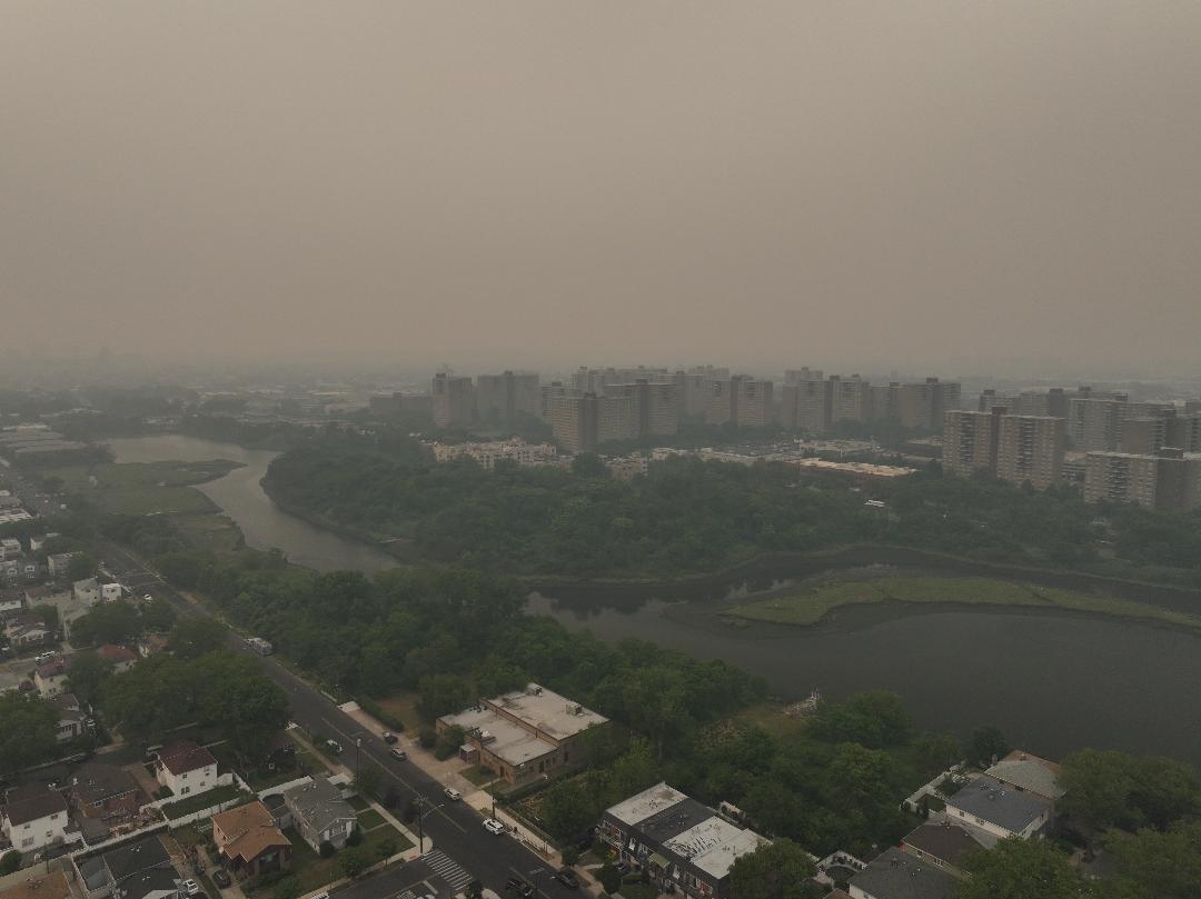 The Canadian wildfires have crept into the Brooklyn area and have presented serious air quality issues. Anyone who goes outside needs to have a good reason and should at least wear a mask. My brief exposure in grabbing these drone shots caused burning of the eyes and exposed skin. These pictures (taken on Wednesday, June 7th) are of the Bayview Housing Development looking toward Canarsie Pier and Starrett City.