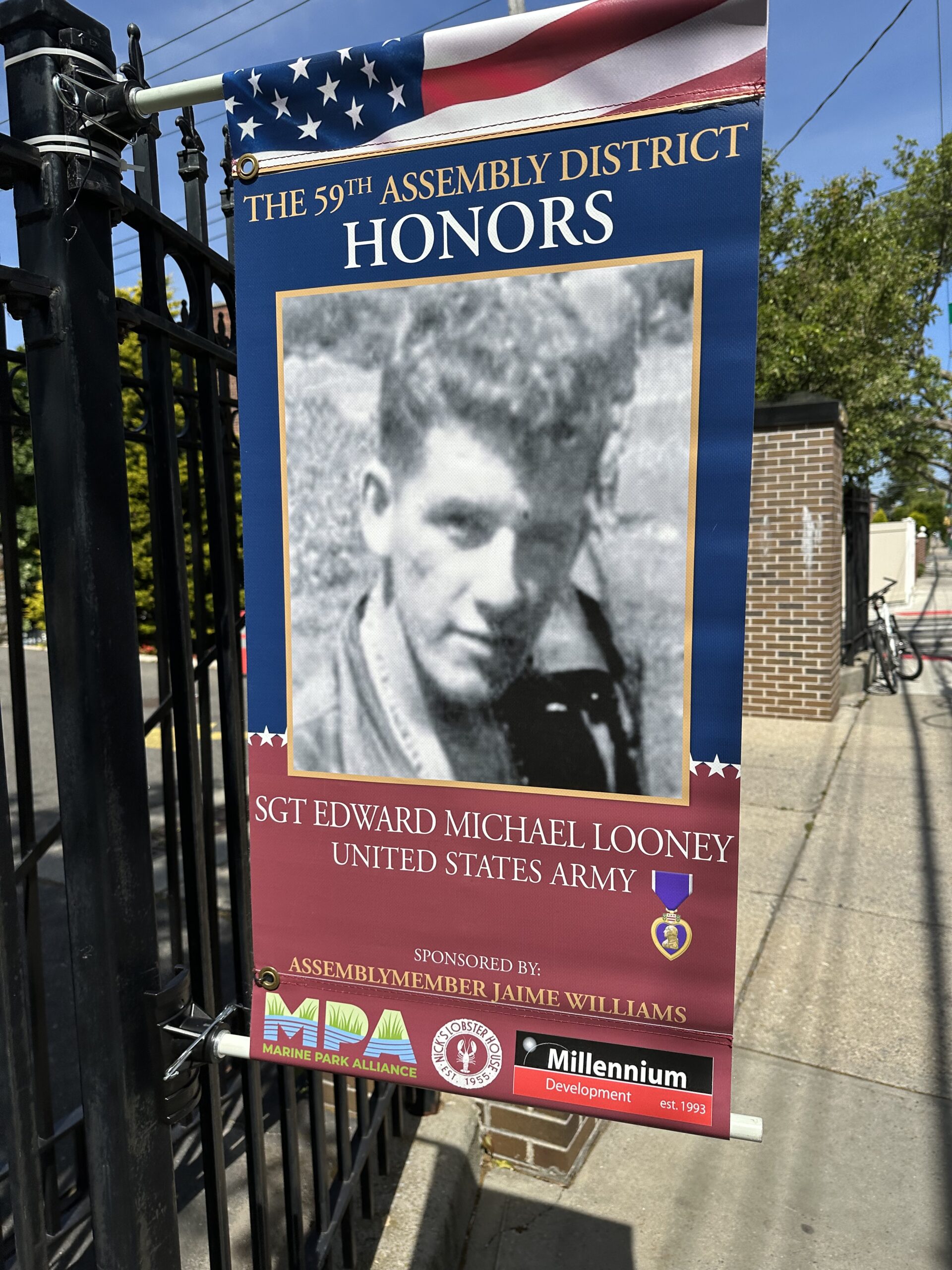 A new addition this year, along the fence of the Canarsie Cemetery, is a beautiful tribute to many of our local fallen heroes – all who resided within Assembly District 59. A banner with a picture of each individual is proudly displayed along the fence on Remsen Avenue, and their names were recited during a touching ceremony. The banners were sponsored by Assemblywoman Jaime Williams in partnership with Millennium Development, Marine Park Alliance and Nick’s Lobster House.
