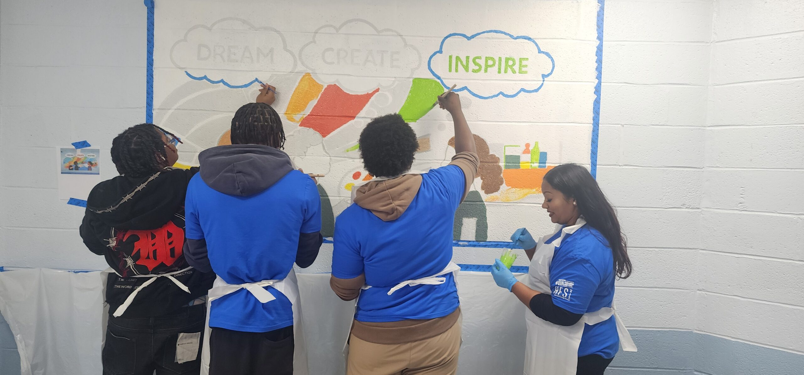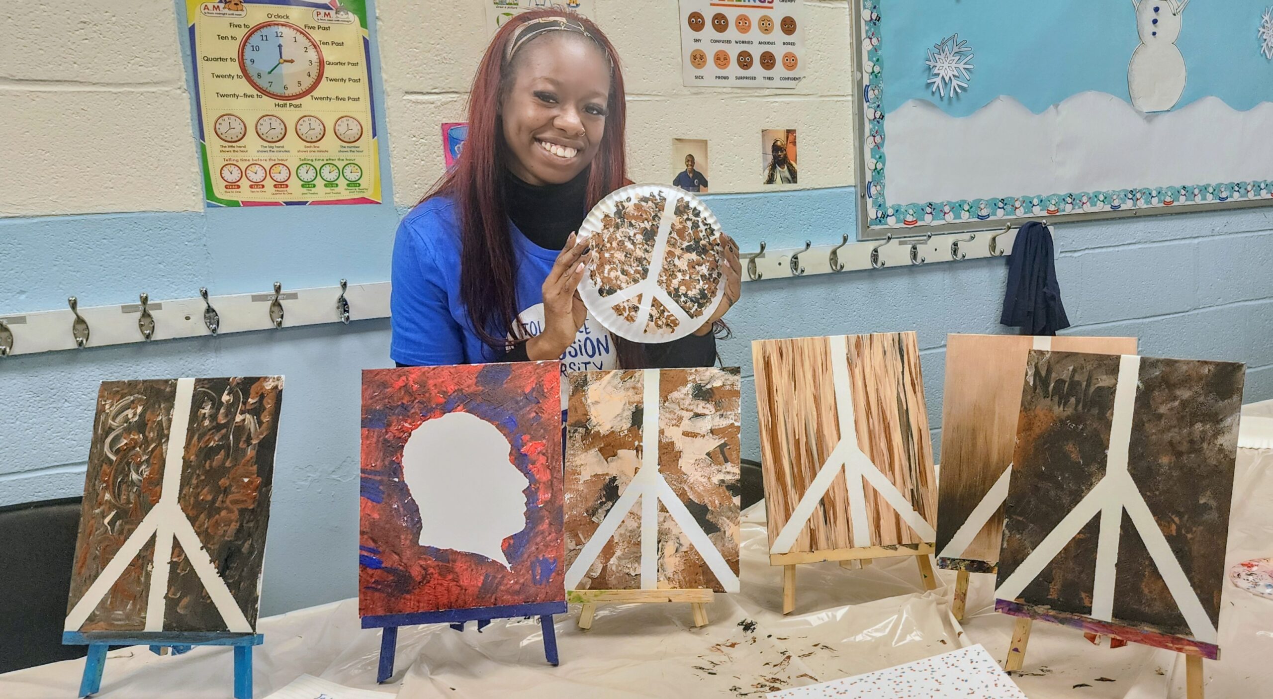 Some volunteers finger painted designs on paper plates, transforming them into artwork with a huge peace sign amid colors that depict black and brown communities. Others took turns painting a mural captioned “Dream, Create, Inspire,” which honored the enduring legacy of the civil rights activist. The overriding messages conveyed in the artwork were also of peace, justice and equality. “There was a dream that Martin Luther King had,” the art instructor stated. “We create and continue to inspire and brought the community in, so we could all do it together,” she added.