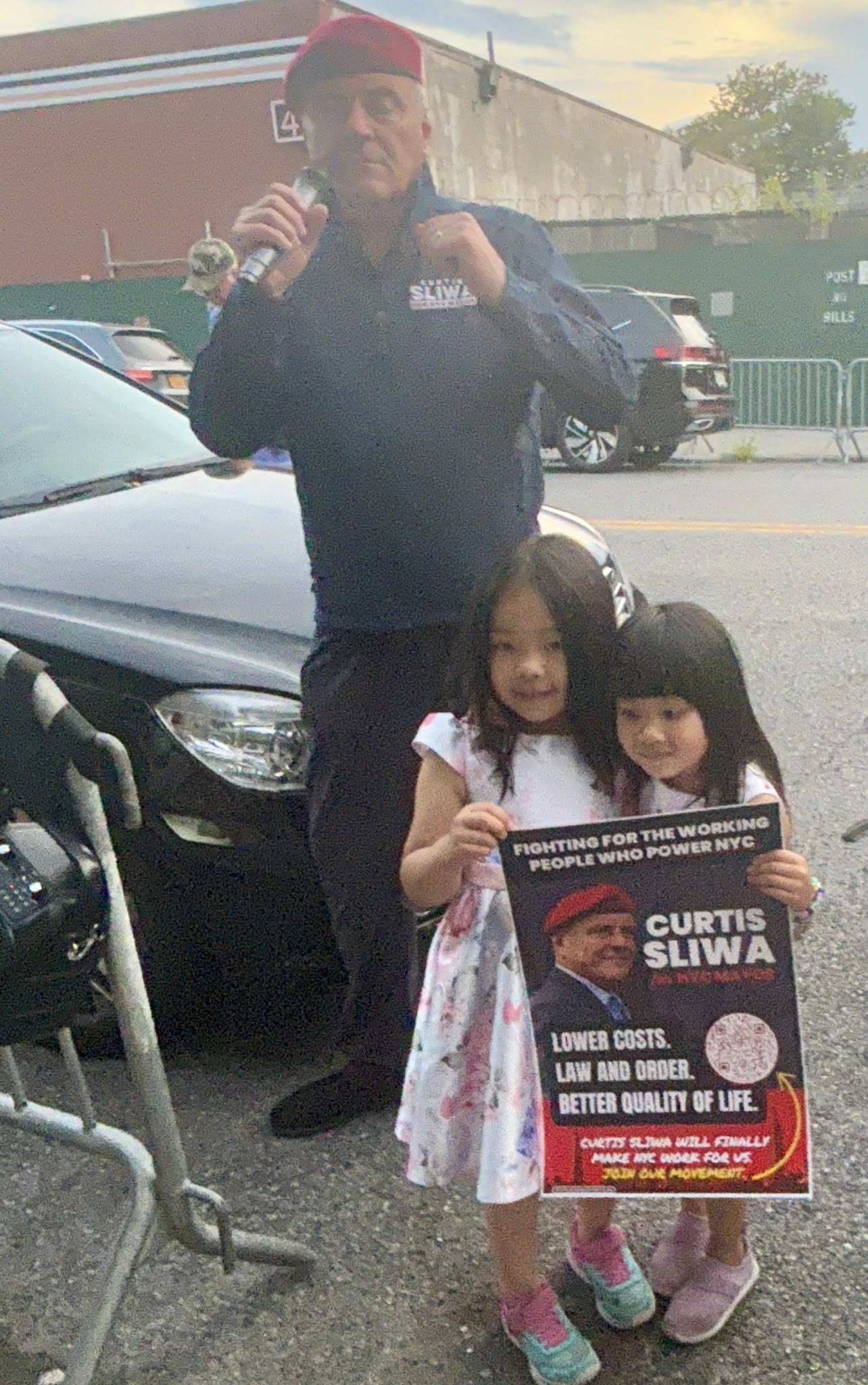 Sliwa was met by a large crowd on Coyle Street, where he delivered a fiery speech condemning Mayor Adams for “handing contracts to developers looking to profit, not to help,” and for disregarding the concerns of families living near the site, which is adjacent to schools, small businesses and homes.