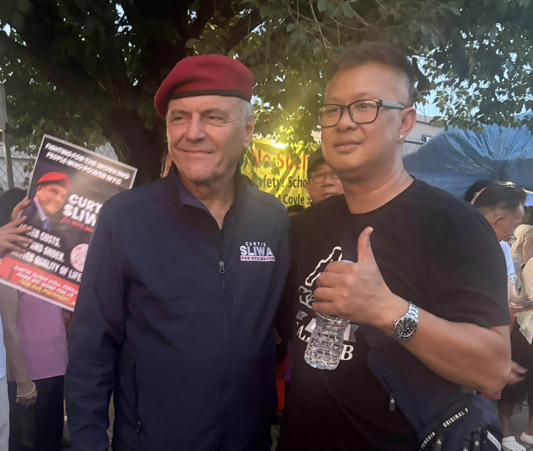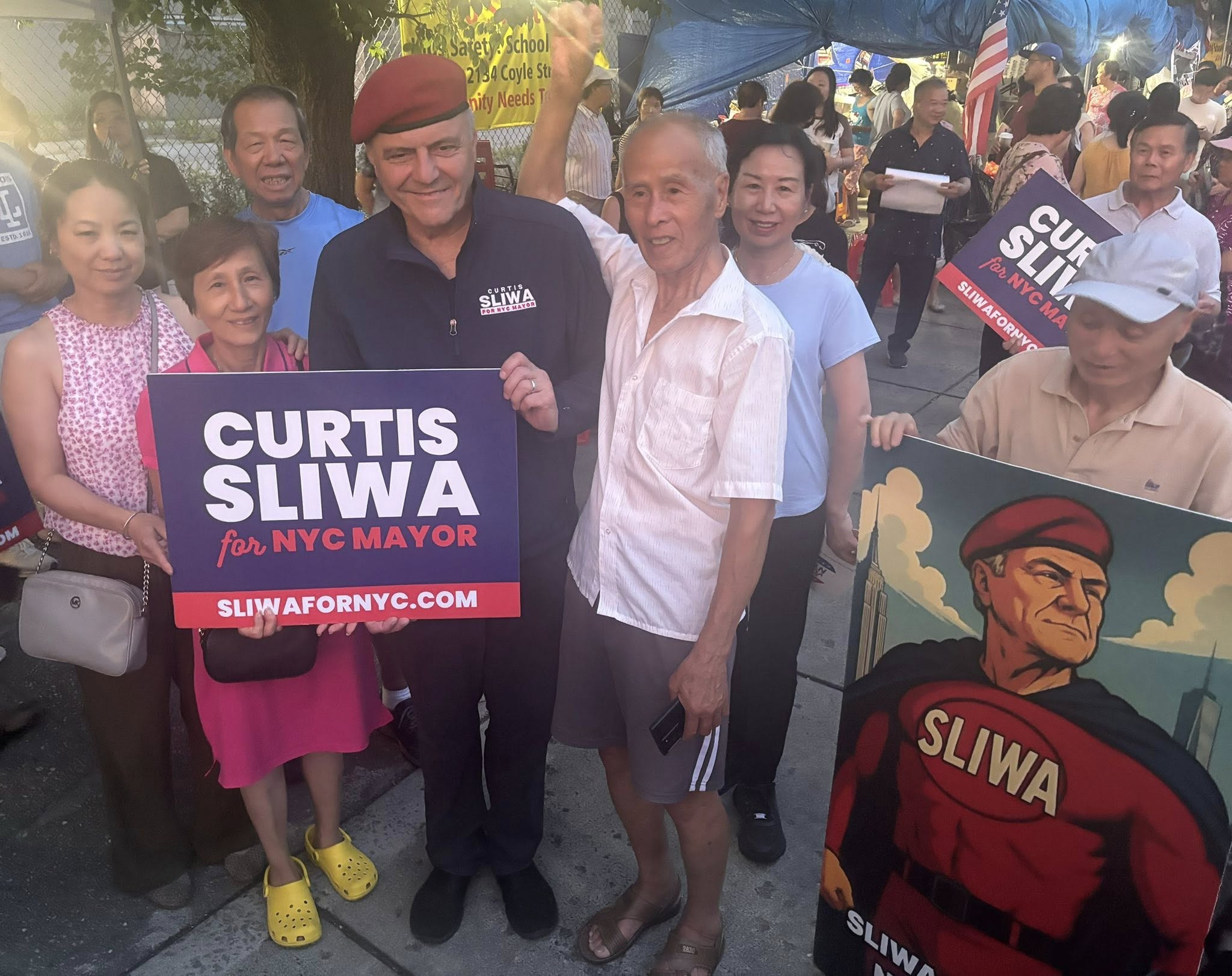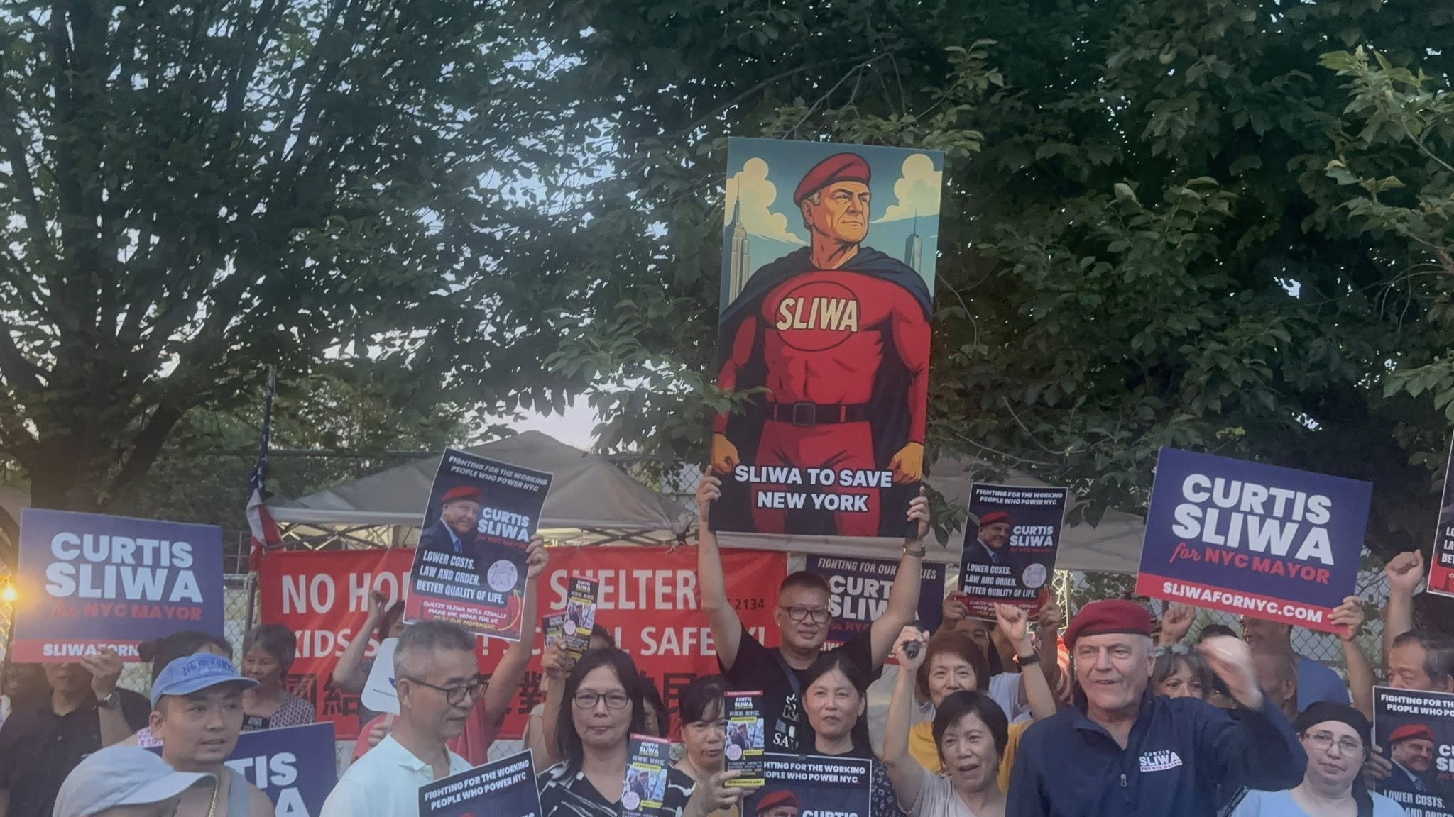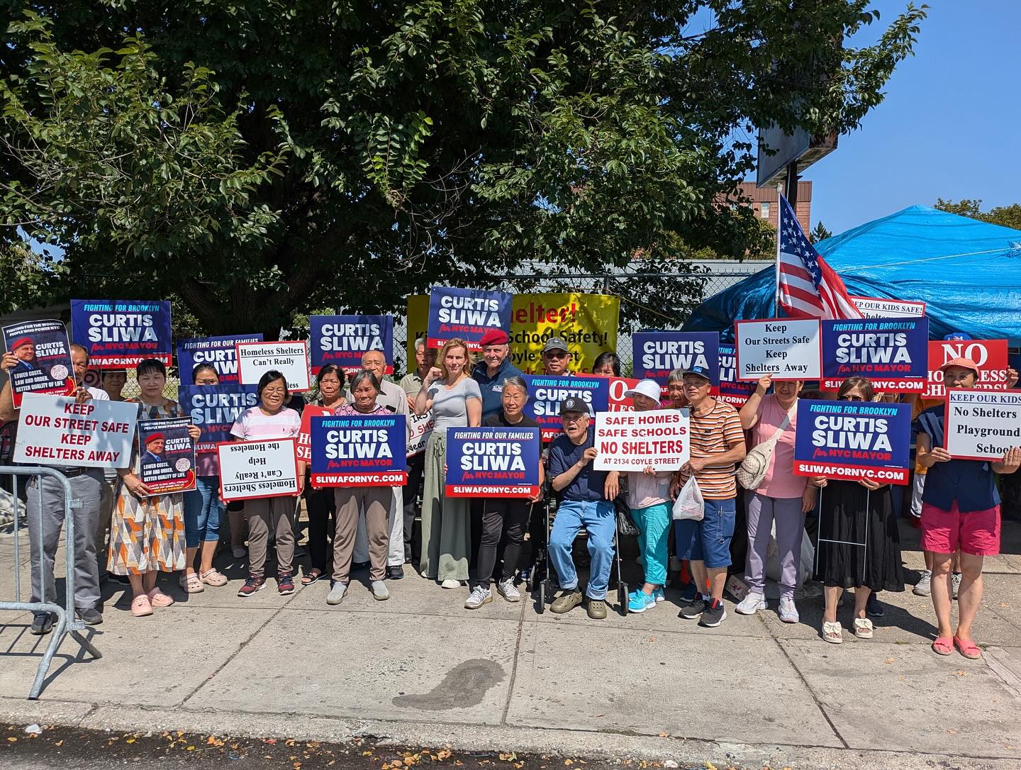 Mayoral candidate Curtis Sliwa returned to 2134 Coyle Street on Friday, July 25th, to stand with Brooklyn’s Asian-American community and local residents who have now spent over one year protesting a proposed homeless shelter project in Sheepshead Bay. The visit was part of his continued opposition to Mayor Eric Adams’ “City of Yes” development initiative, which Sliwa has vowed to revoke if elected.
