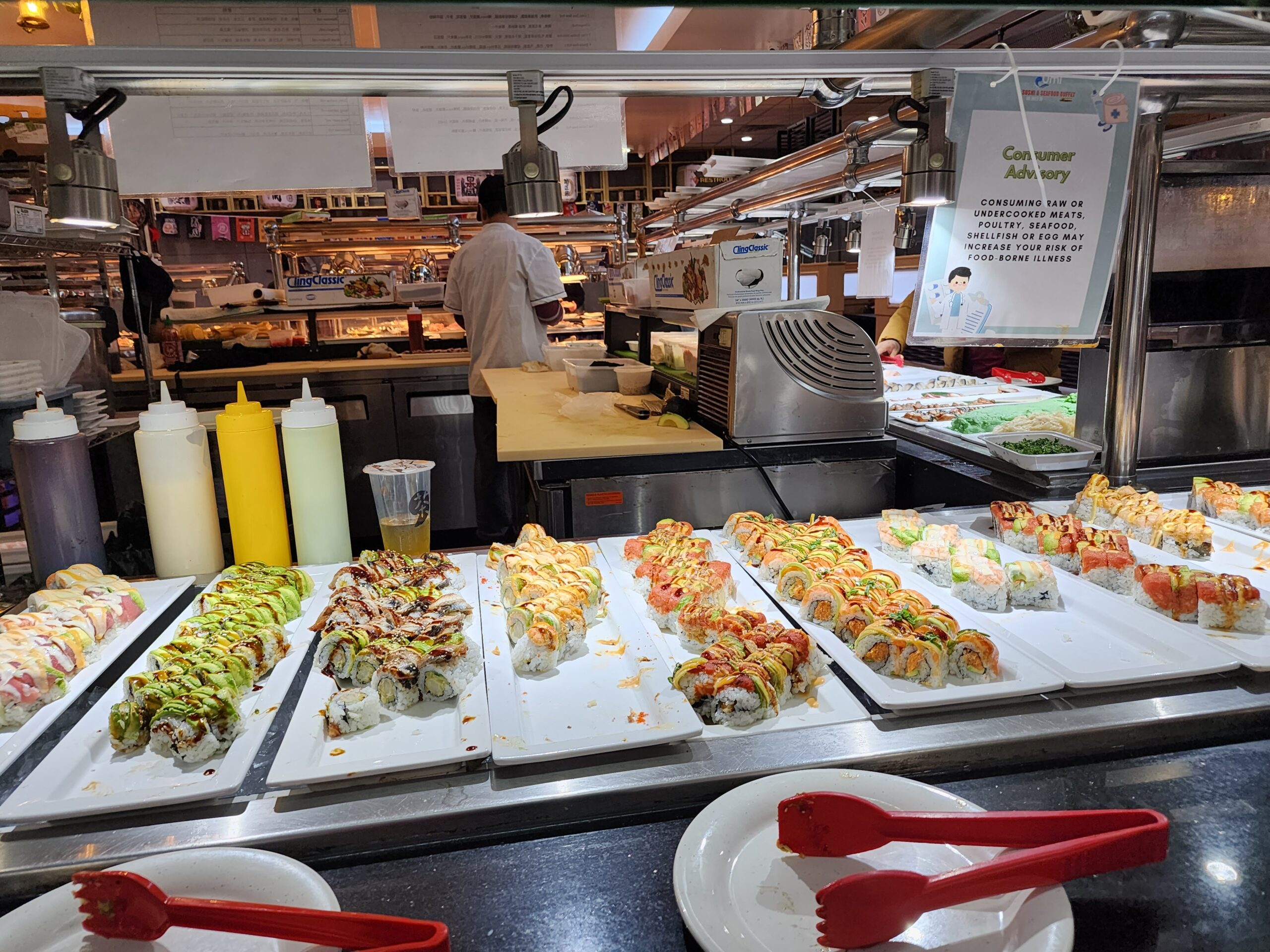 If you’re looking to enjoy a traditional hot meal, this massive one-stop eatery also serves grilled salmon, steamed or fried flounder, as well as other varieties of fish. And, believe it or not, you can also get lamb chops, steak, ribs, chicken, french fries and onion rings. Rice, grilled corn on the cob, green salad and vegetables are also available. However, if you’re the unshrinking, adventurous sort, you might appreciate the raw clams, scallops, shrimps or oysters, all served cold.