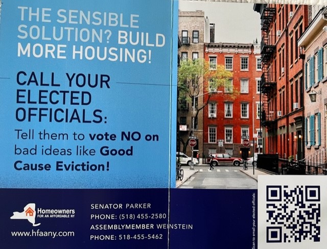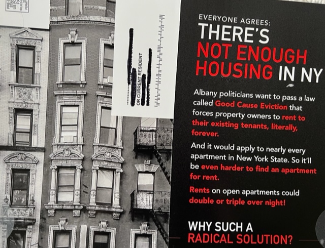 A hot political issue, local homeowners are receiving mailings from those on one side of the issue to contact their elected officials to vote “No” on Good Cause Eviction while progressives fight for its passage.
