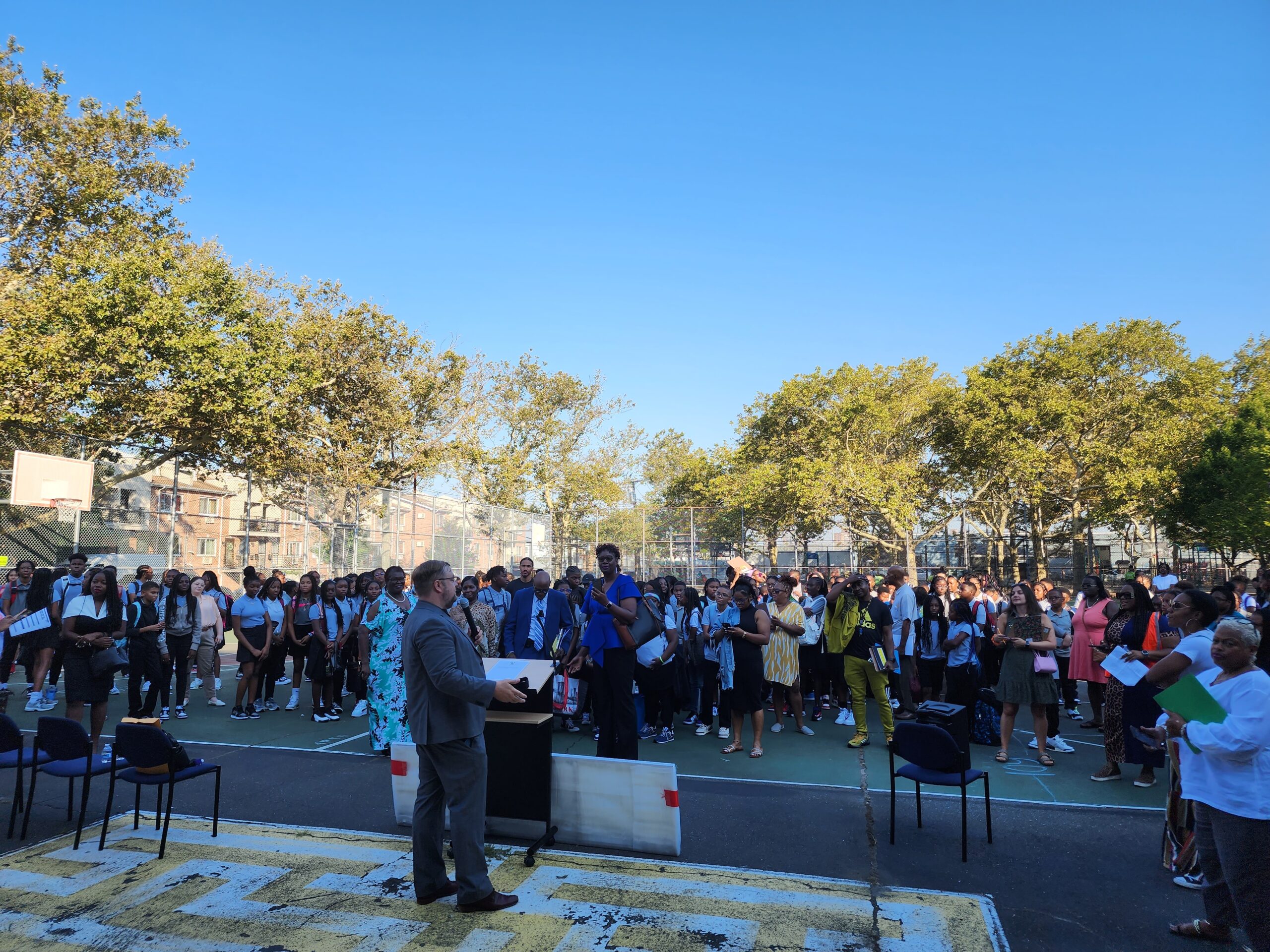 When students turned out for the first day of school at Lenox Academy M.S. 961 on Thursday, September 7th, Parent Coordinator Ronald Harris was waiting outside to greet them before they and their parents assembled in the schoolyard at 100-01 Flatlands Avenue for a ribbon-cutting ceremony that symbolized a new beginning at the academy.