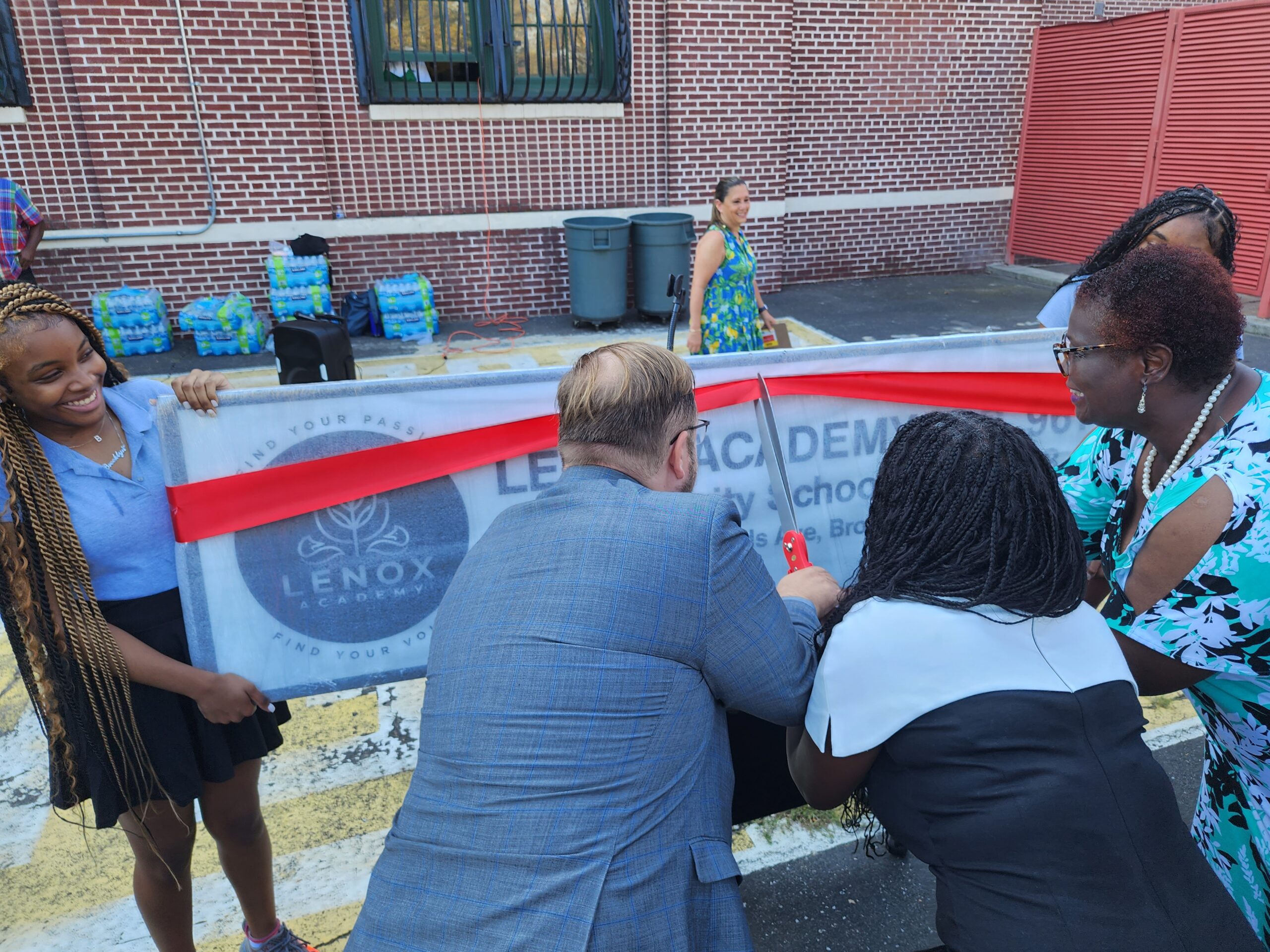 The ribbon-cutting was performed by Superintendent Terry, Principal Berry, Senator Persaud and two 8th graders. “Guess what, 8th graders?” Berry said to them. “You are going to be the first group of graduates from Lenox Academy M.S. 961!